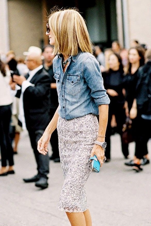 Cách mix đồ rất thú vị giữa váy ren và sơ mi denim giúp tăng vẻ khỏe khoắn cho trang phục.