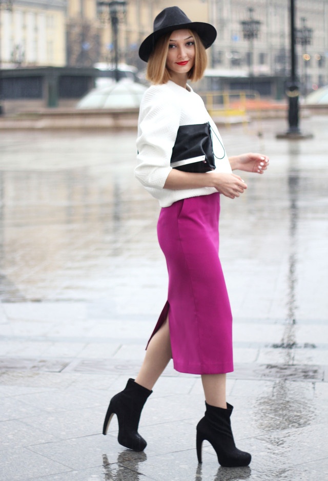 Váy bút chì với tông hồng tím kết hợp cùng áo lửng có thể sử dụng khi dự tiệc.
