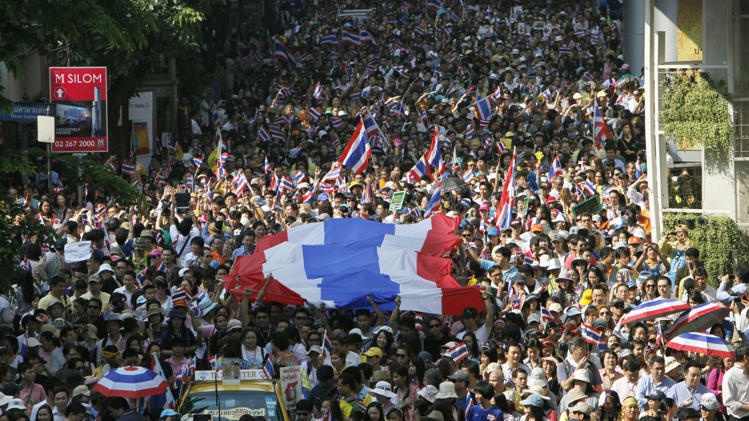| Khoảng 100.000 tới 200.000 người tham gia cuộc tuần hành tới trụ sở chính phủ Thái Lan hôm nay. Họ chia thành 9 đoàn dưới sự chỉ đạo của một tổ chức mang tên Ủy ban Cải cách Dân chủ Nhân dân. Tất cả các đoàn đều tiến về trụ sở chính phủ. Ảnh: Reuters |