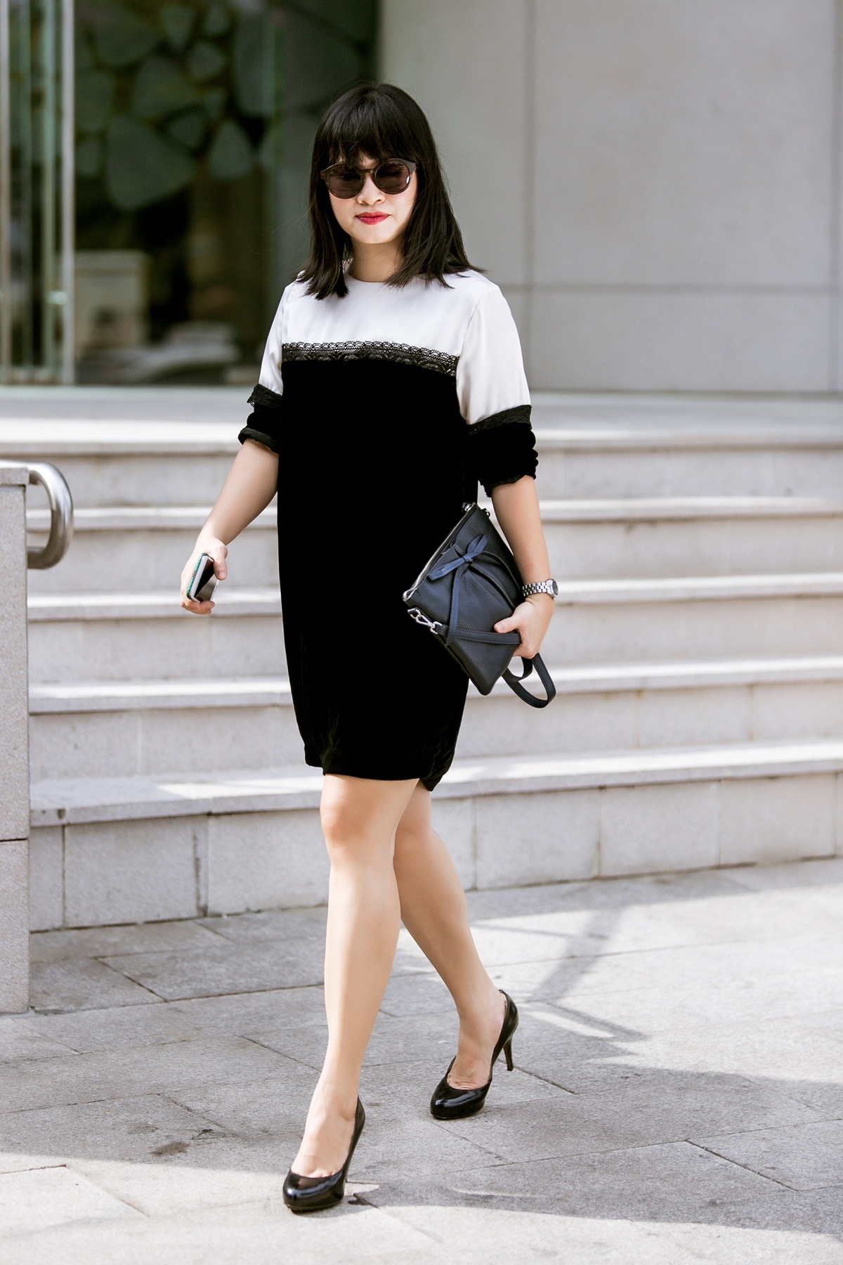 | Những trang phục màu đơn sắc, trung tính như màu đen, trắng là sự lựa chọn phù hợp cho những quý cô văn phòng. Bạn có thể lựa chọn kiểu mix đơn giản với váy đen đi kèm giày cao gót và clutch cầm tay |