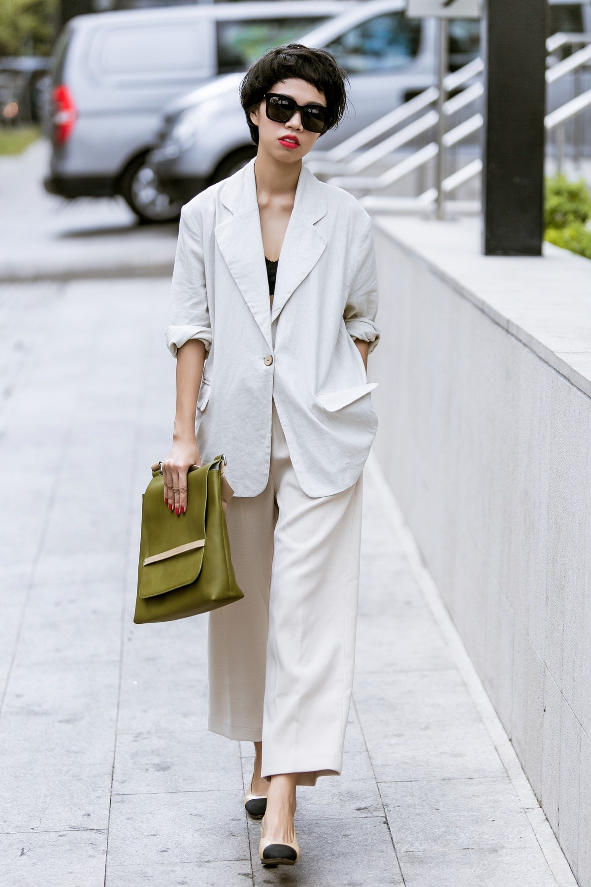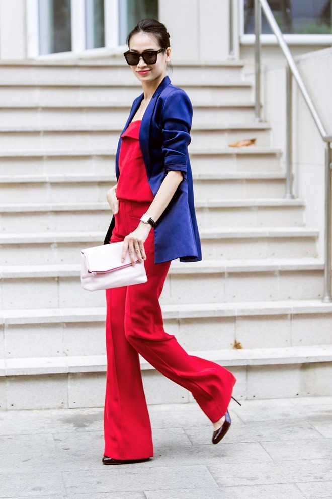 | Thời điểm giao mùa, các icon thời trang đã sẵn sàng làm mới tủ quần áo của mình. Cựu người mẫu Thanh Trúc khoe vóc dáng trong bộ cánh màu tương phản ấn tượng. Cô khoác thêm blazer xanh thanh lịch. Chiếc clutch màu nude phối kèm phù hợp. |