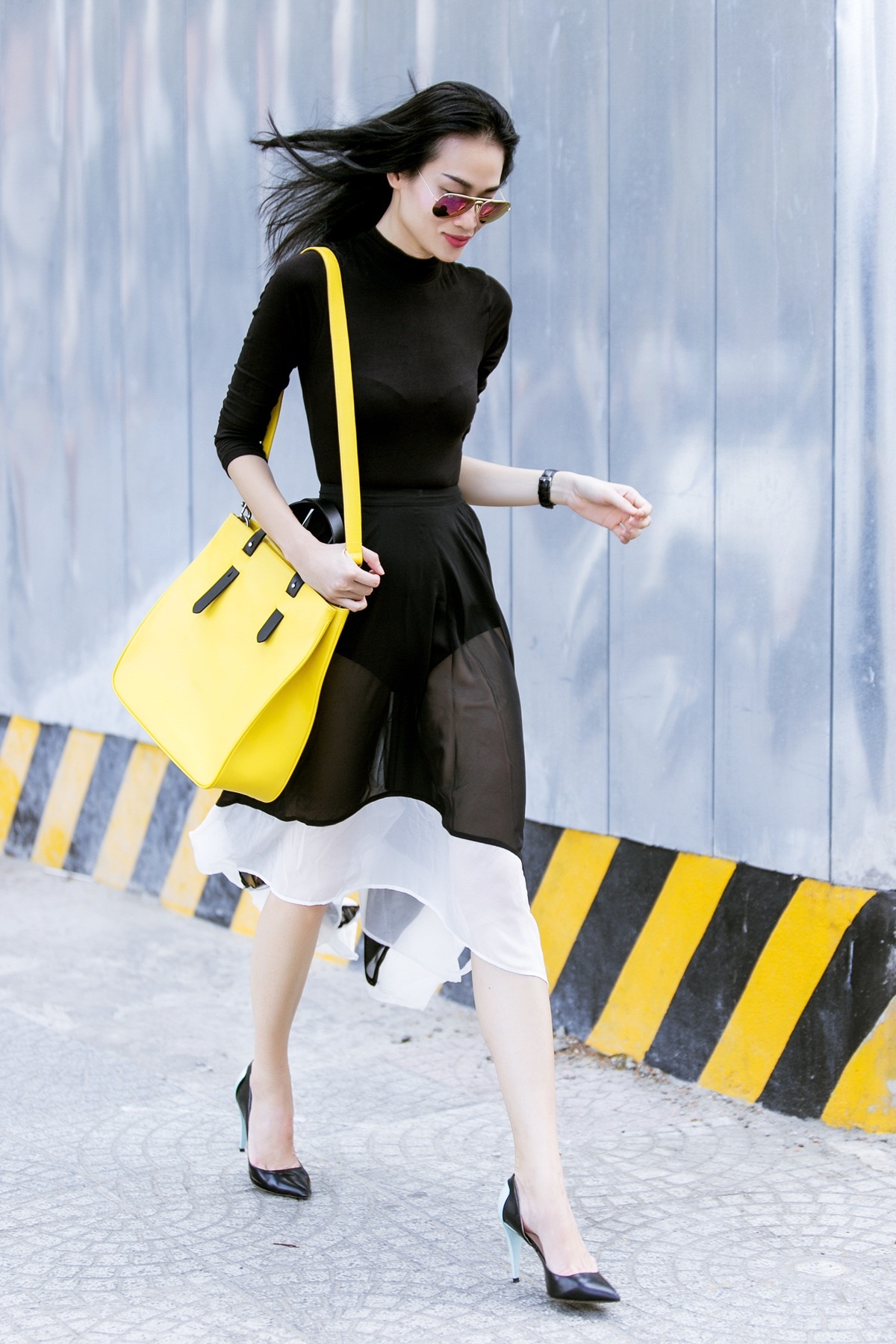 Một set đồ màu đen sẽ được tô điểm hoàn hảo nhờ chiếc túi xách vàng chanh bản to, phù hợp cho những nàng công sở năng động.