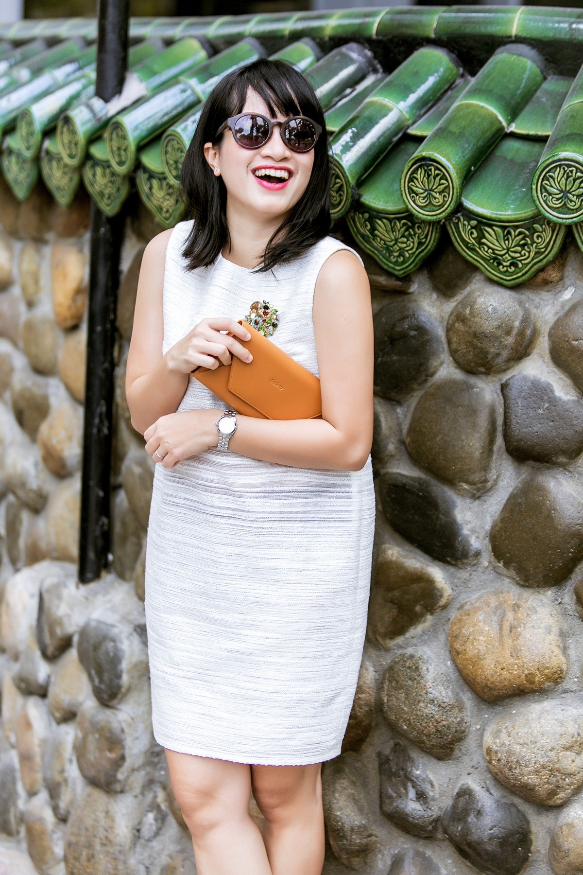 | Trắng đen chưa bao giờ là nhàm chán, một chiếc túi phù hợp với bộ váy sẽ khiến giới văn phòng thu hút người đối diện. Trong ảnh, biên tập viên Liên Chi chọn phụ kiện tông đen đồng điệu cùng bộ cánh. |