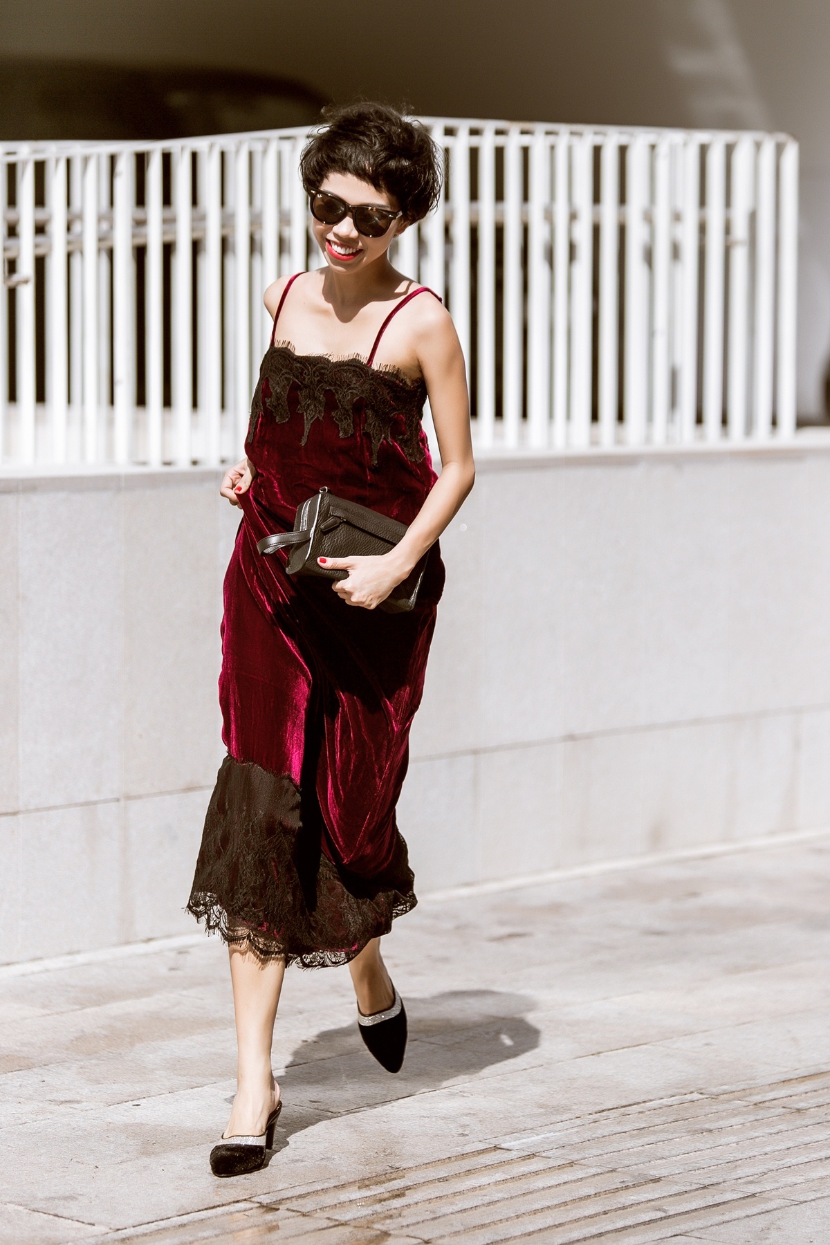 | Một bộ váy chất liệu nhung pha ren lưới sẽ khiến bạn vô cùng nổi bật và thời thượng trên phố. |