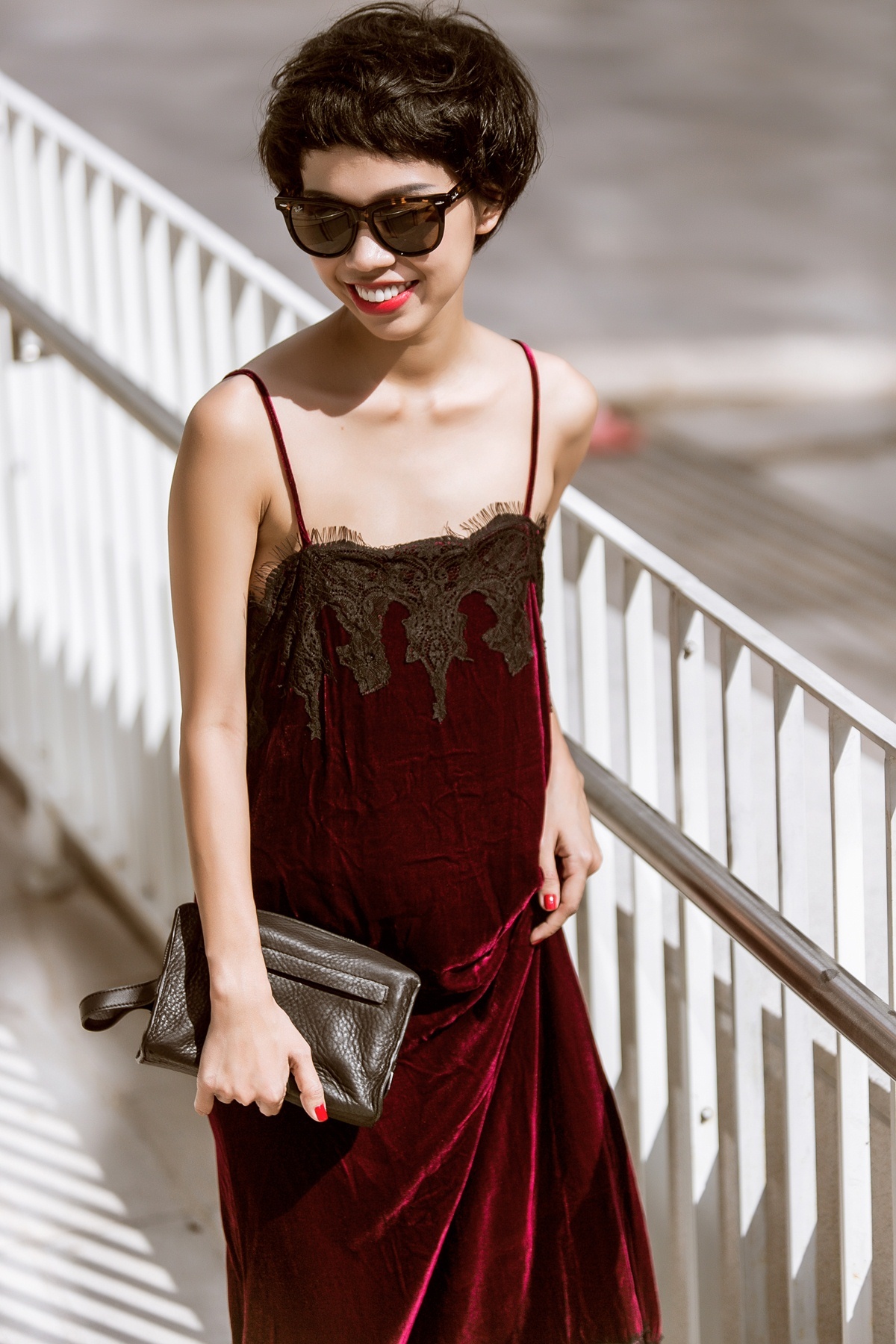 | Chất liệu lụa bóng cũng là một trong những chọn lựa được gợi ý vào mùa hè. Gam màu đen trang phục giúp phụ kiện giày, ví nhỏ nổi bật. |