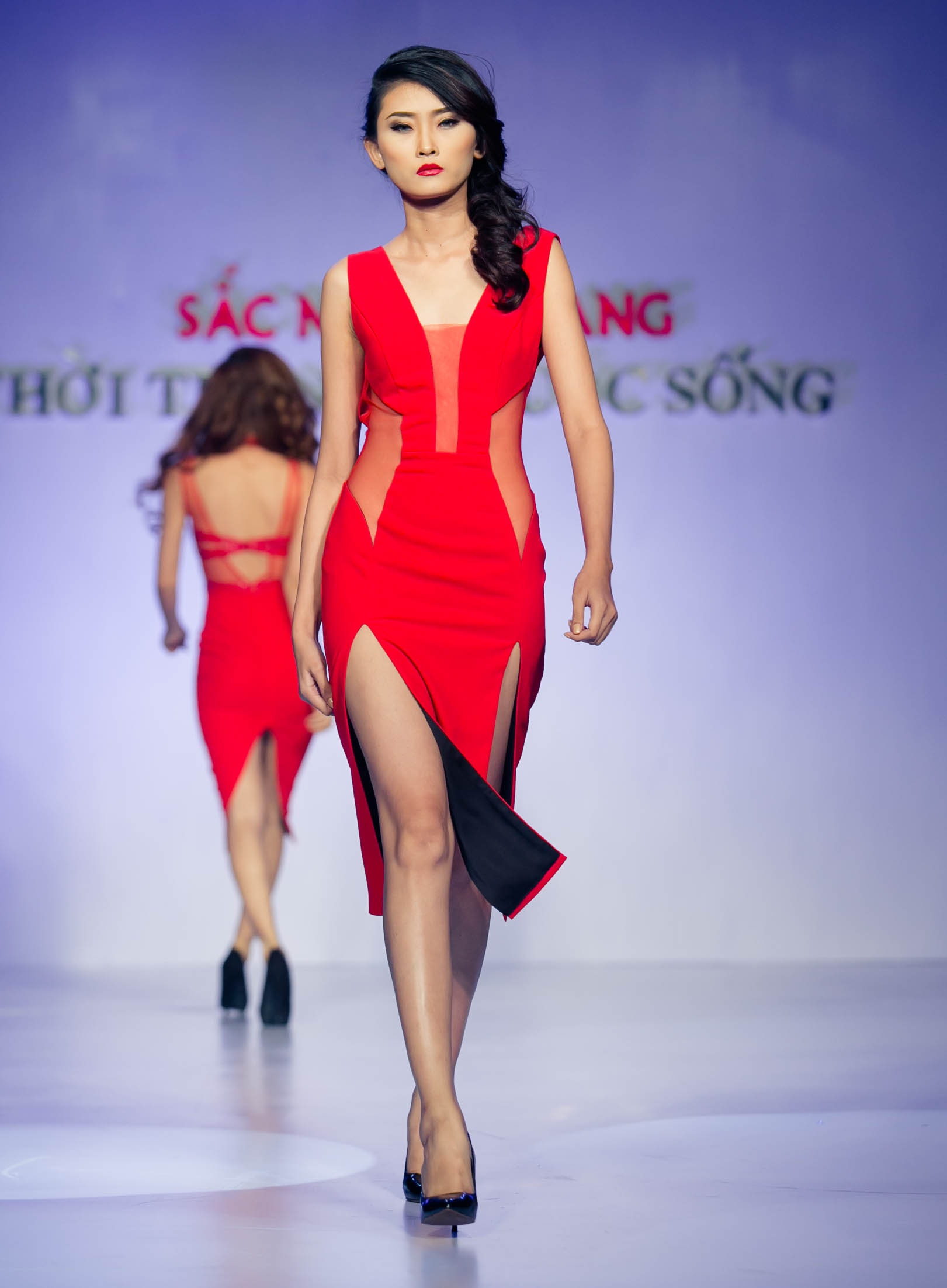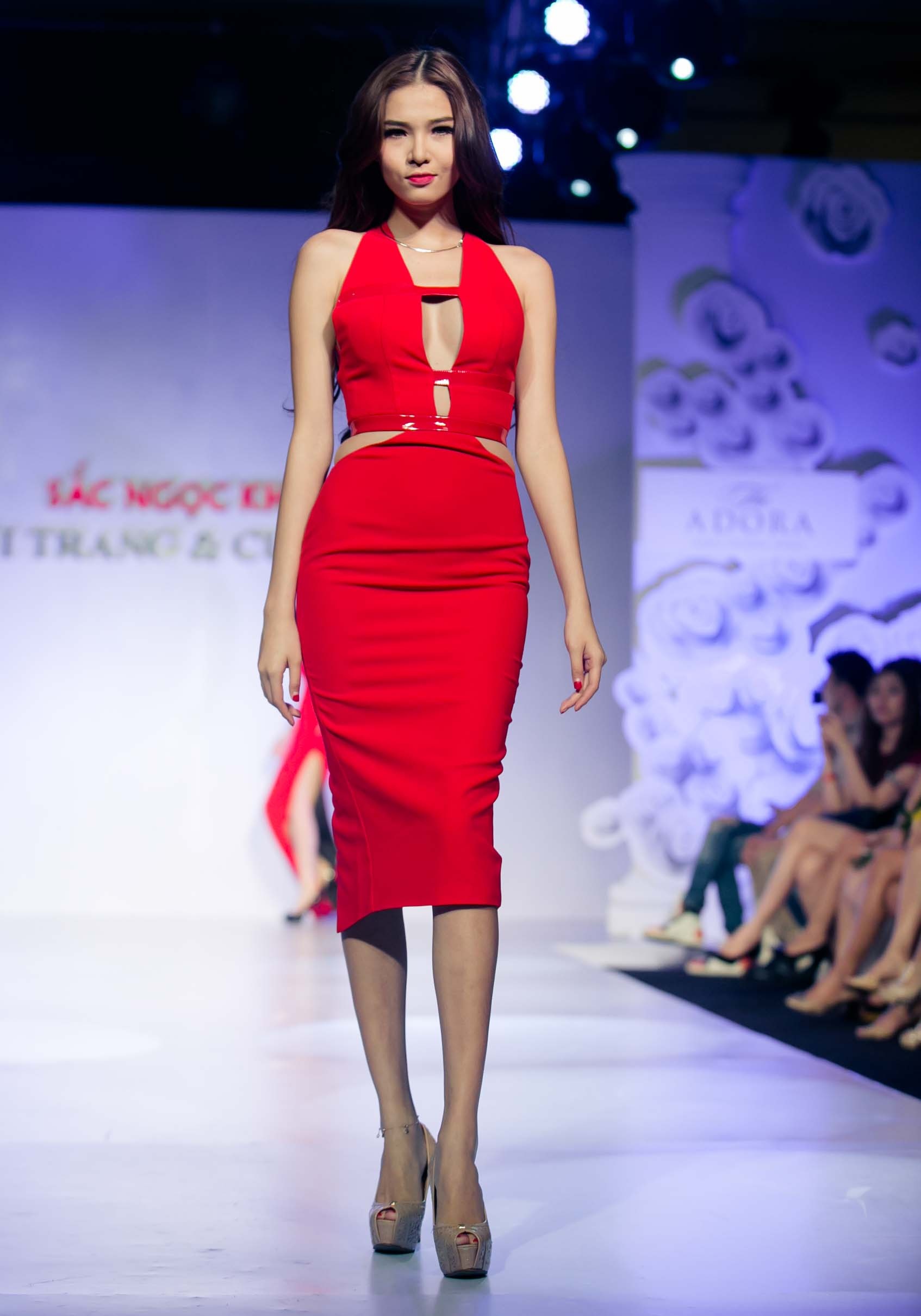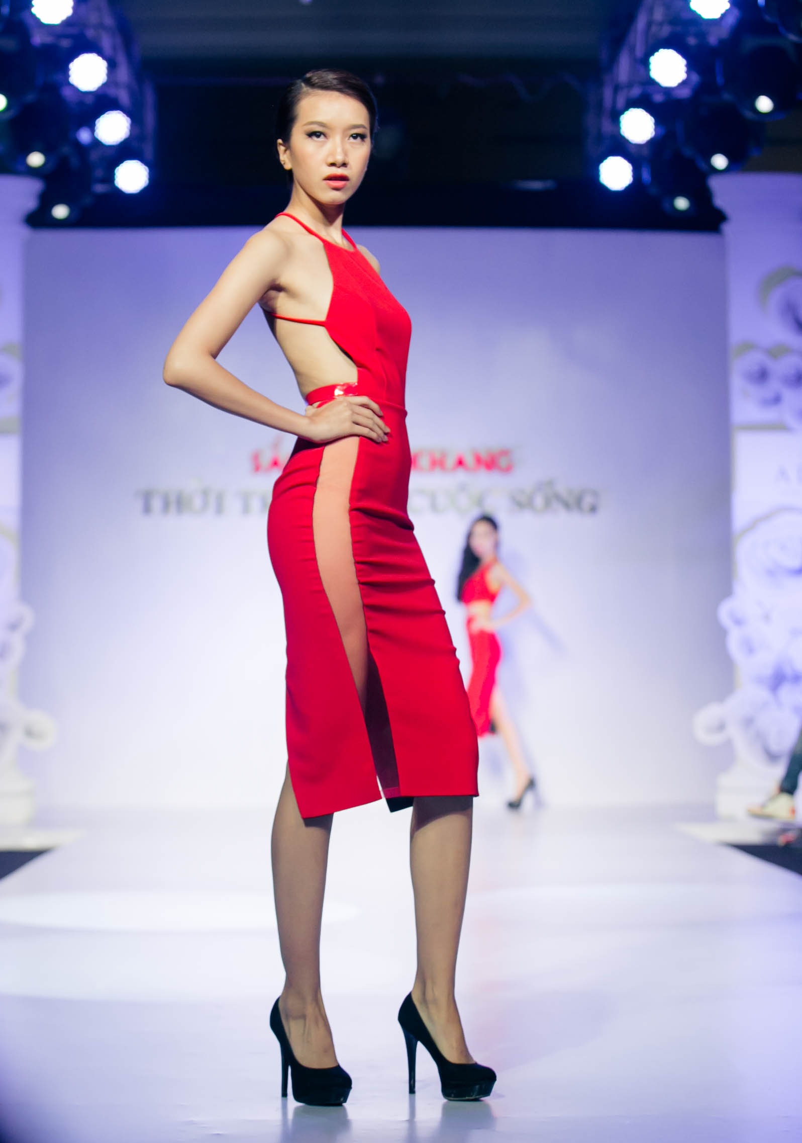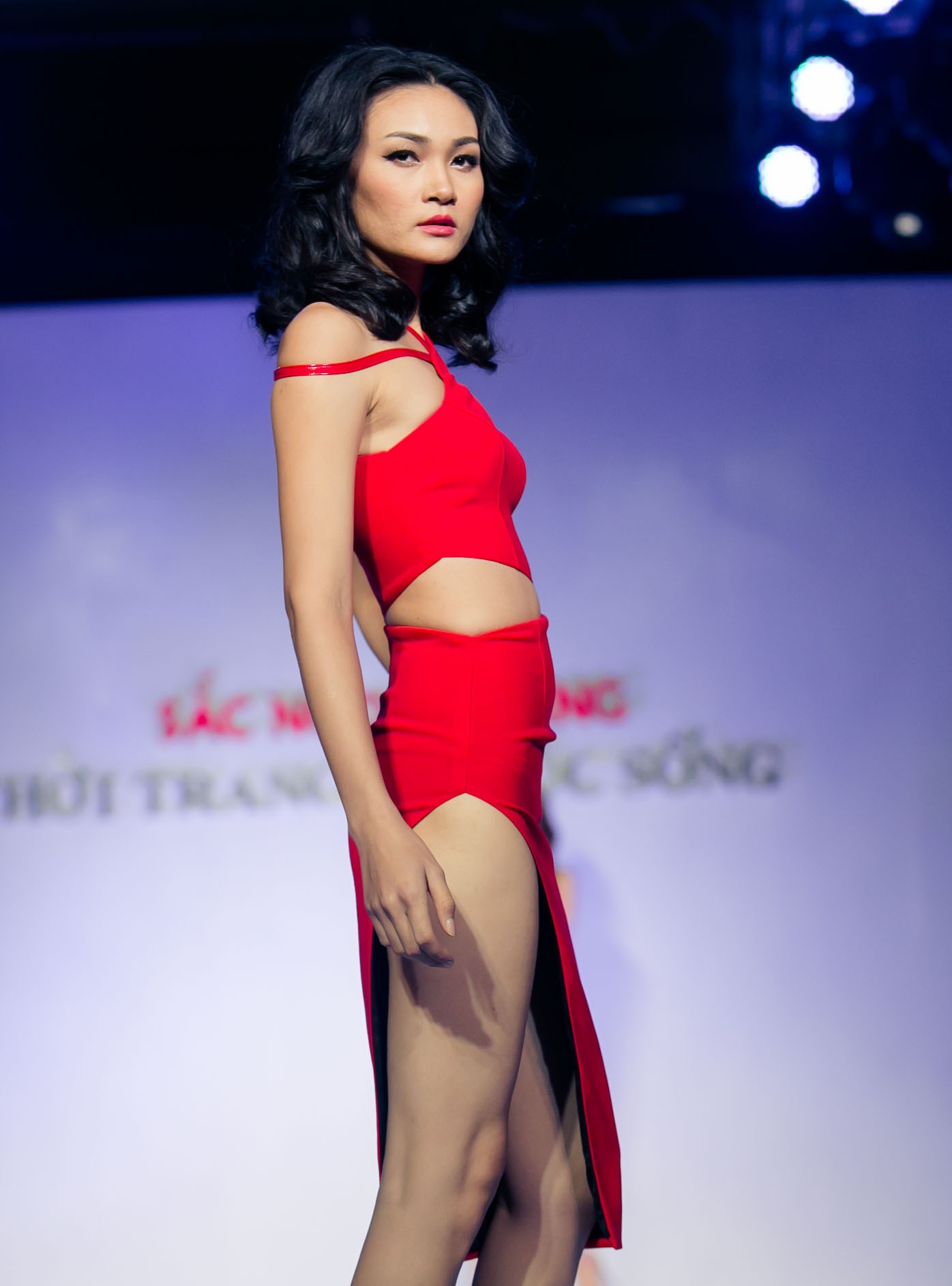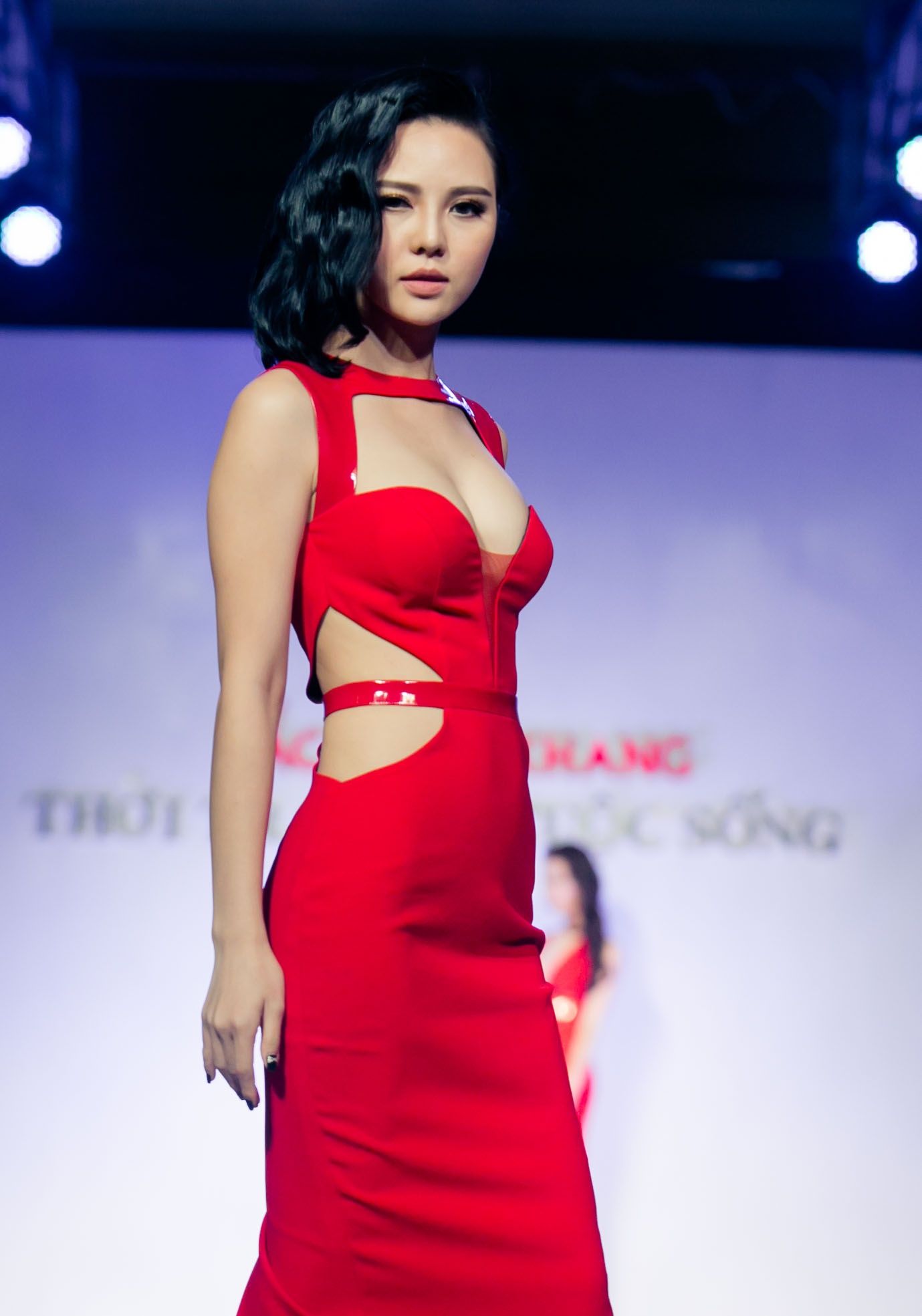 | Để trình diễn bộ sưu tập, các người mẫu phải khéo léo phô diễn vóc dáng, tránh để lộ nội y khi diện những thiết kế có khoảng hở tại hông, ngực áo. Mốt diện trang phục cut-out không nội y cũng là một trong những xu hướng gợi cảm được các mỹ nhân làng giải trí ưa chuộng. Người mẫu Trà Giang trình diễn một thiết kế táo bạo, cắt cúp ở phần ngực áo. Tông màu đỏ giúp cô nổi bật trên sàn diễn. |