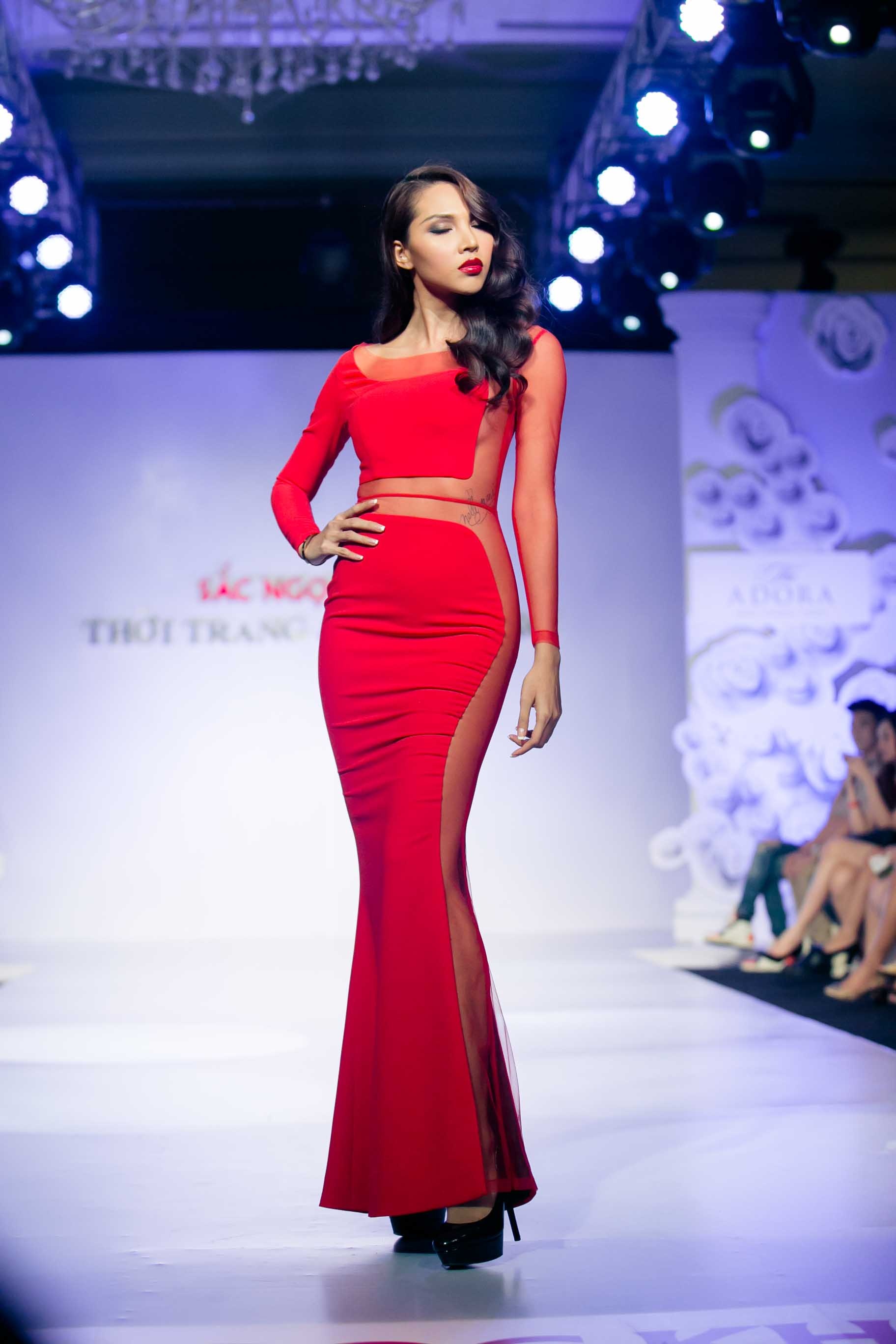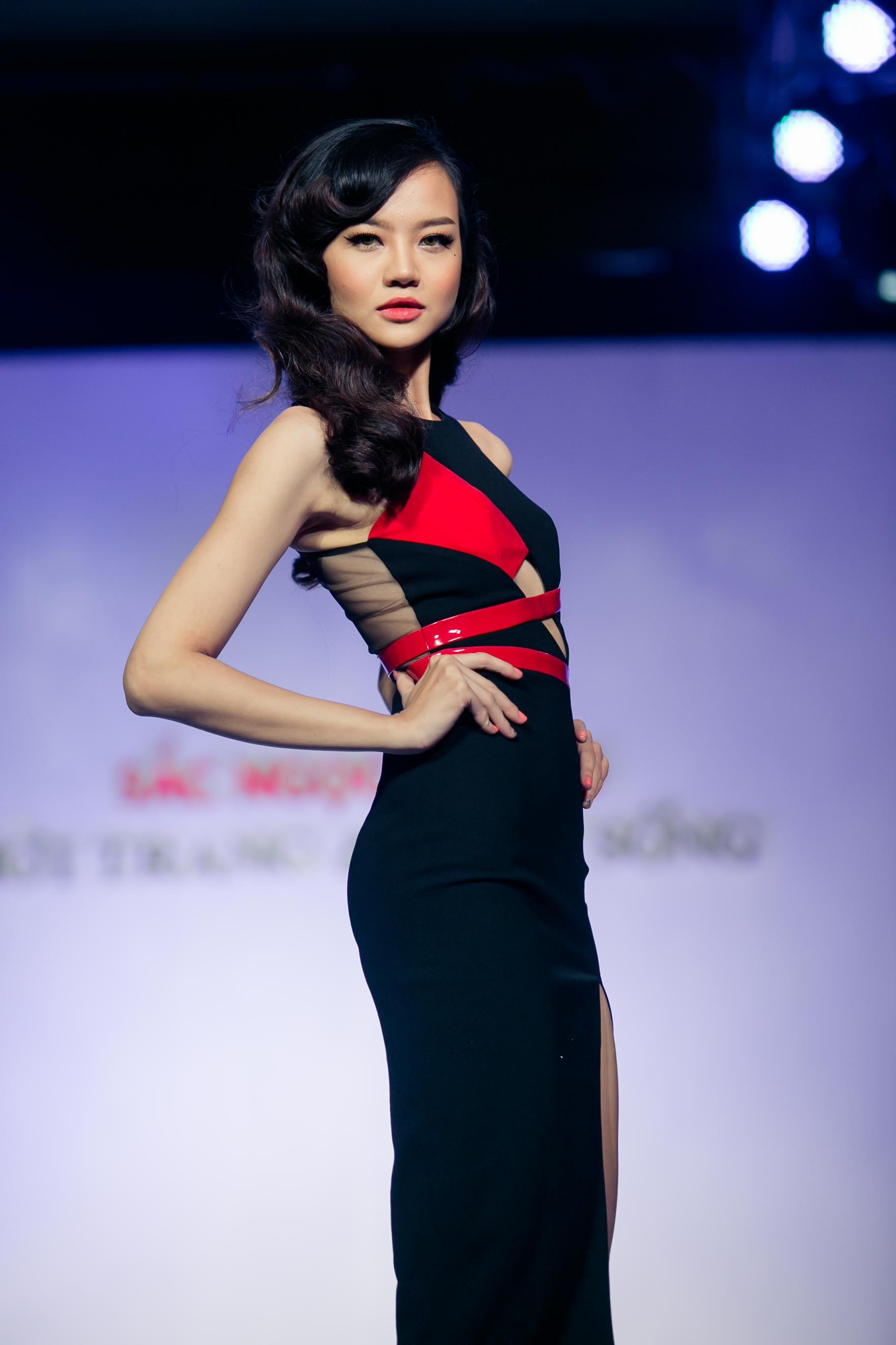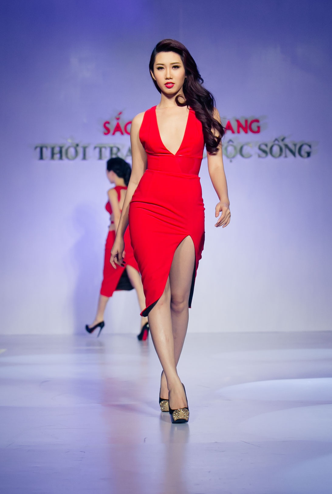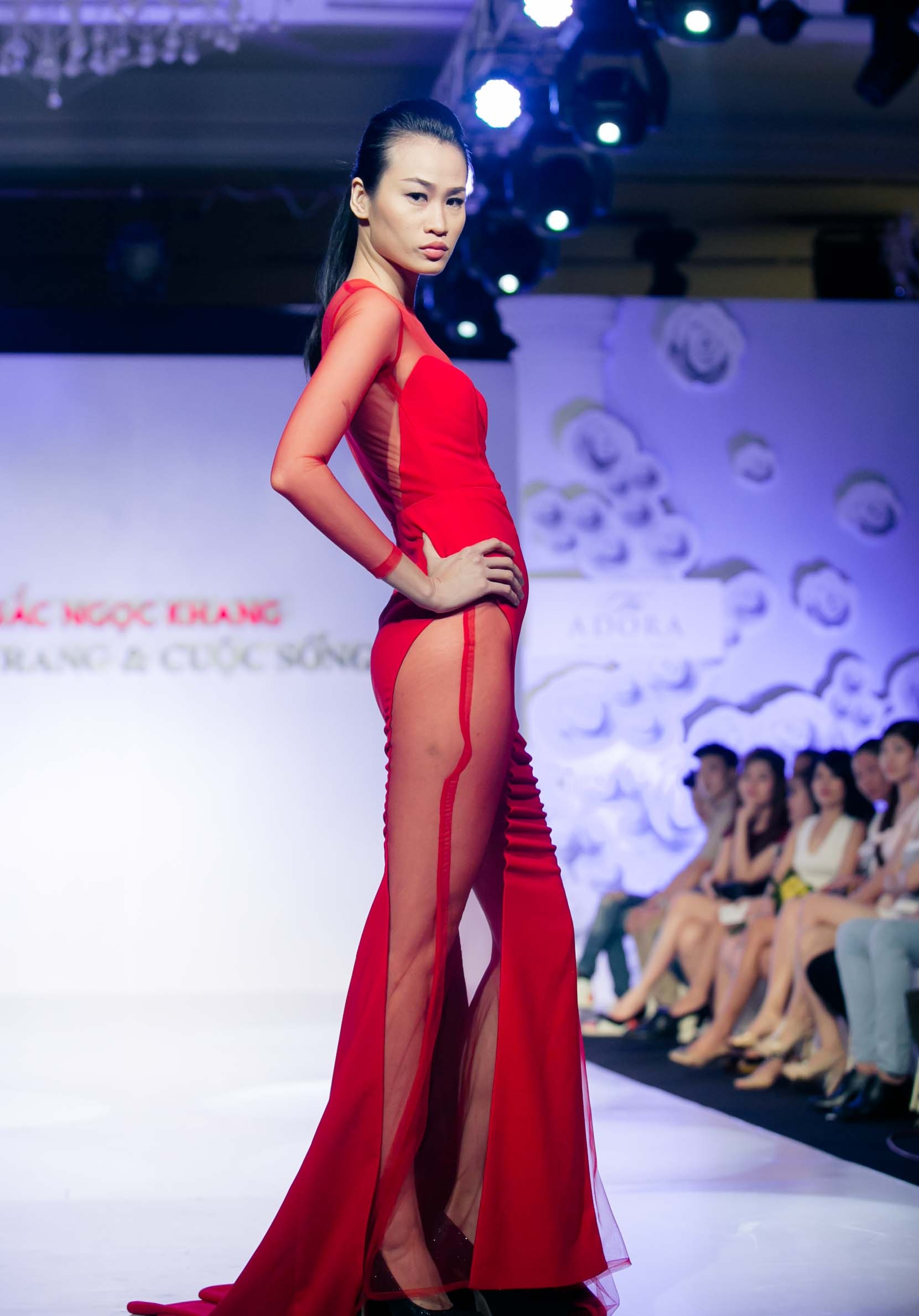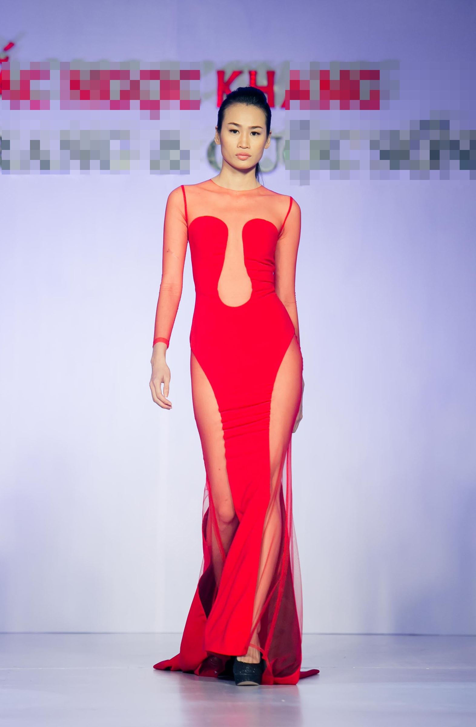 | Để trình diễn bộ sưu tập, các người mẫu phải khéo léo phô diễn vóc dáng, tránh để lộ nội y khi diện những thiết kế có khoảng hở tại hông, ngực áo. Mốt diện trang phục cut-out không nội y cũng là một trong những xu hướng gợi cảm được các mỹ nhân làng giải trí ưa chuộng. Người mẫu Trà Giang trình diễn một thiết kế táo bạo, cắt cúp ở phần ngực áo. Tông màu đỏ giúp cô nổi bật trên sàn diễn. |