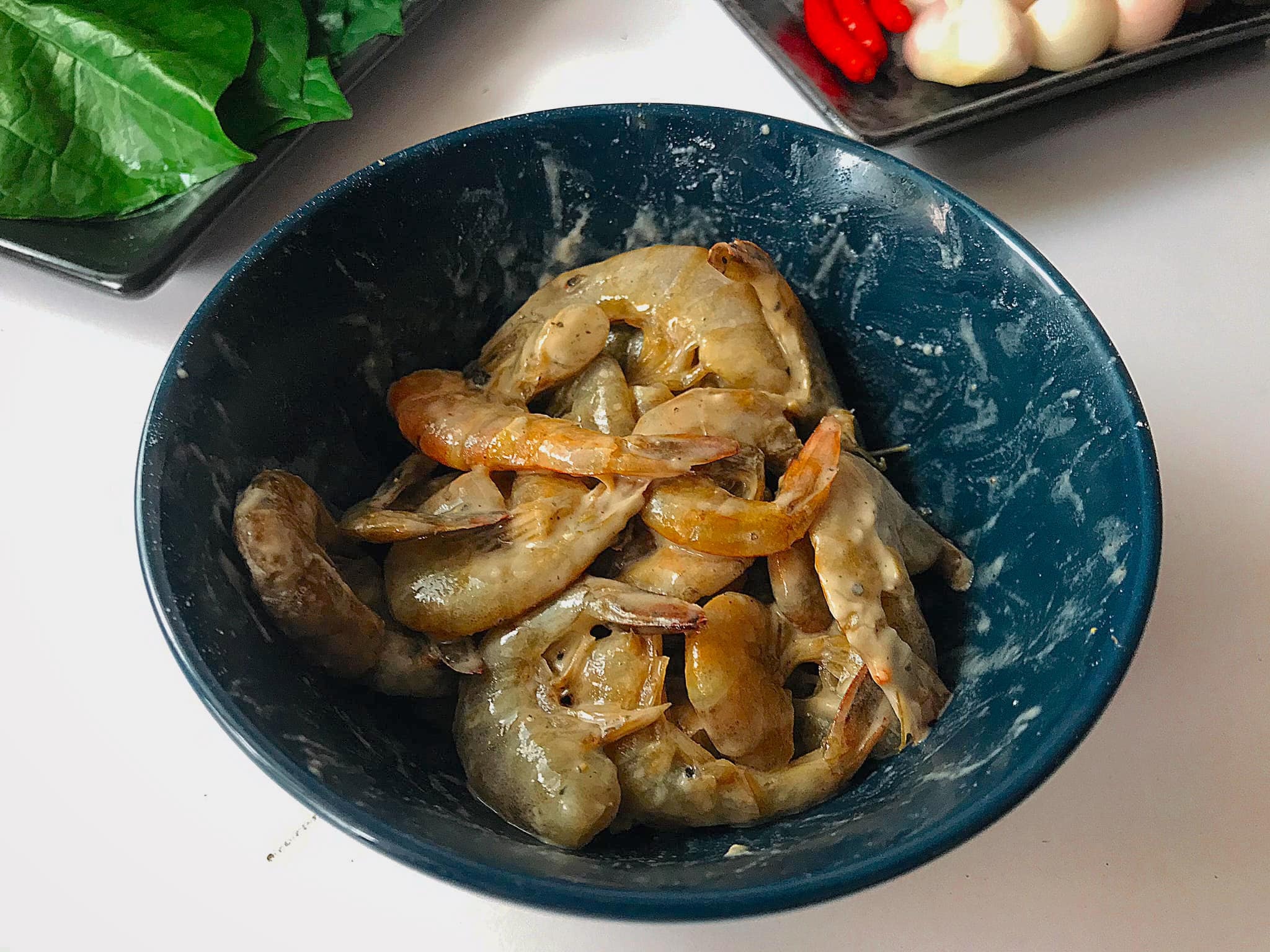 - Sơ chế tôm, ướp với 1 chút bột canh, bột ngọt, tiêu và trộn đều.