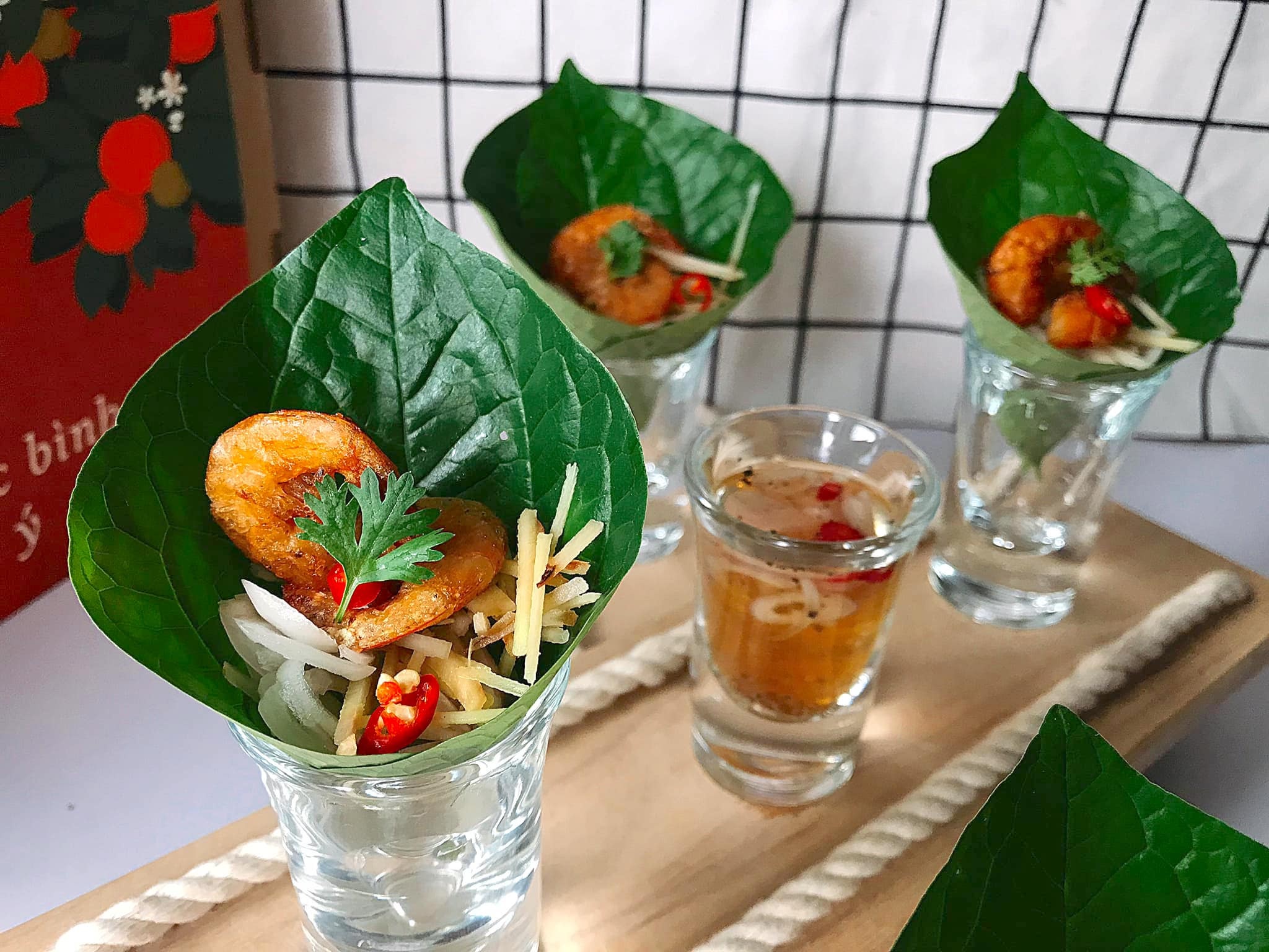 - Dùng lá lốt bọc tôm, hành, riềng. Thêm ngò, ớt nếu thích và chấm vào nước mắm để cảm nhận trọn vị đậm đà.