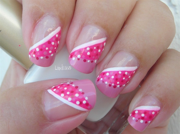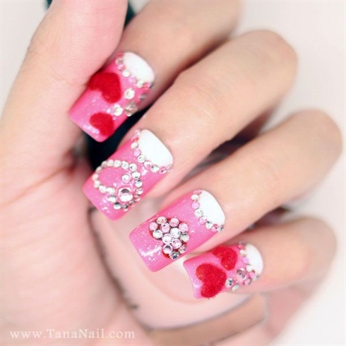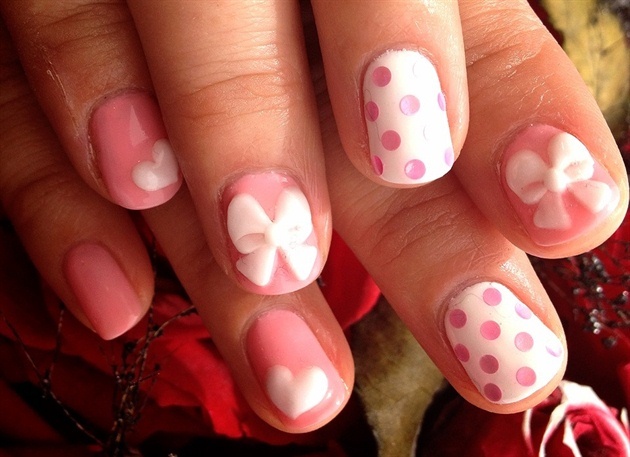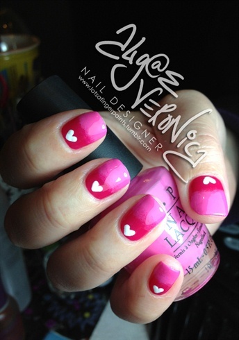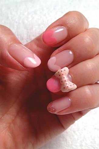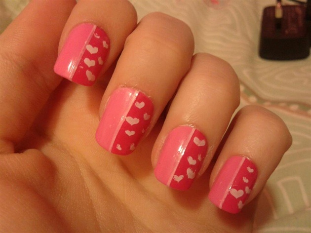 | Những gam màu hồng từ đậm tới nhạt được mix với nhau tinh tế cộng với hình trái tim nhỏ xinh màu trắng tạo nên một bộ nail cực xinh xắn. |