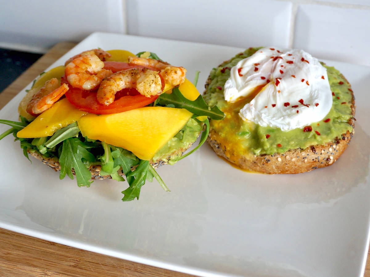 - Với lát bánh mì thứ hai: Thêm trên lớp bơ một ít rau arugula, sau đó cắt lát xoài, một lát cà chua và tôm đặt lên trên. Nêm với muối và hạt tiêu.