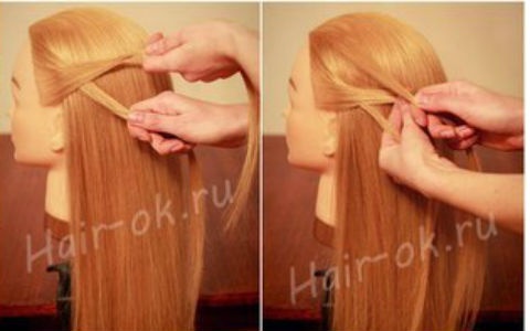 | Tiếp tục quy trình: tết ba, xoắn tóc, thả một lọn tóc cũ, lấy một lọn tóc mới cho tới khi phần tóc tết vắt ngang, ôm hết toàn bộ mái tóc như hình. Dùng cặp ghim cố định lại phần tóc thừa. Sau đó, lấy hai lọn tóc cũ gần nhất được thả xuống trước đó, kết hợp với phần đuôi tóc thừa để tiếp tục tết ba. |