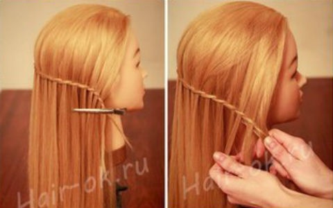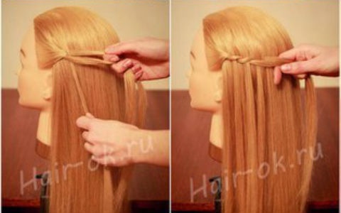 Đầu tiên, lấy ba lọn tóc bên tay trái và bắt đầu tết theo kiểu thác nước. Bạn tết sát vào chân tóc, sau khi hoàn thành 1 nút tết như hình bên trái, bạn thả lọn tóc cuối cùng xuống. Rồi lấy thêm một lọn tóc khác và tiếp tục tết ba thông thường.