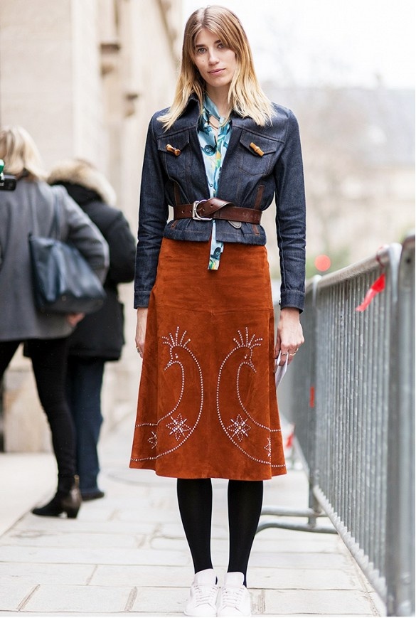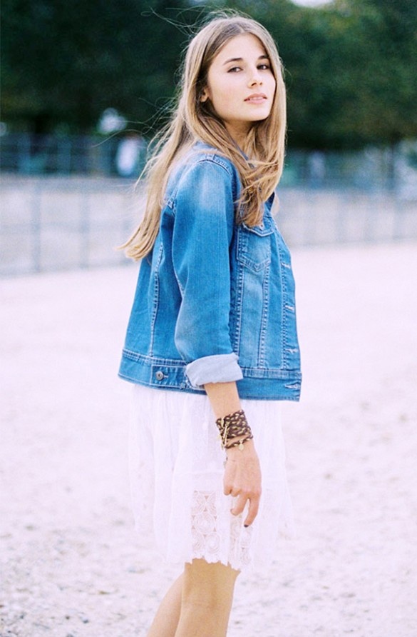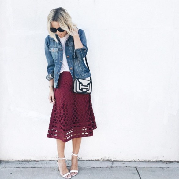 | Mẫu áo denim jacket cổ điển kết hợp cùng váy midi thích hợp với nhiều phong cách. |