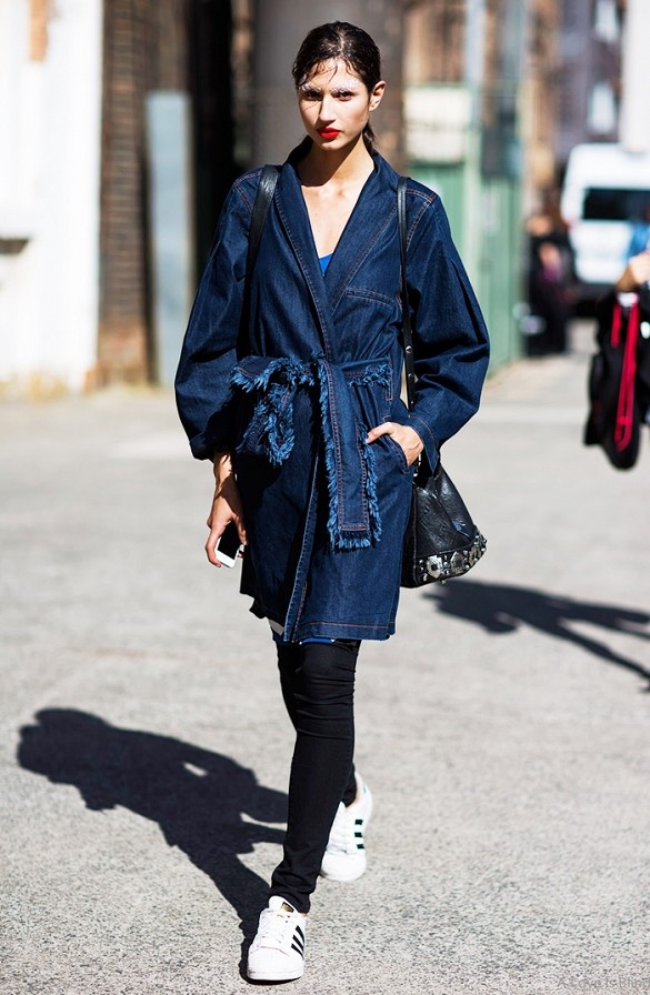 | Áo denim jacket dáng dài kiểu trendcoat với biến tấu là phần thắt lưng tua rua làm hài lòng các cô gái cá tính ngày lạnh. |