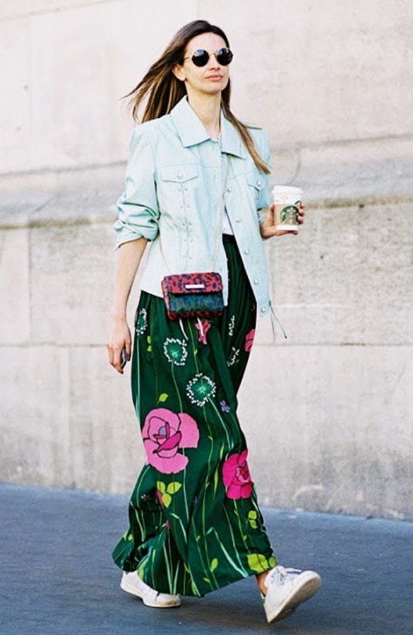 | Denim jacket kiểu dáng oversize mix kèm chân váy maxi hoa và giày sneakers trắng trẻ trung, năng động. |