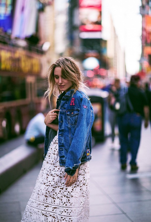 | Với váy ren điệu đà, bạn sẽ trở nên cá tính với một chiếc áo khoác oversize với điểm nhấn là các hình đắp. |