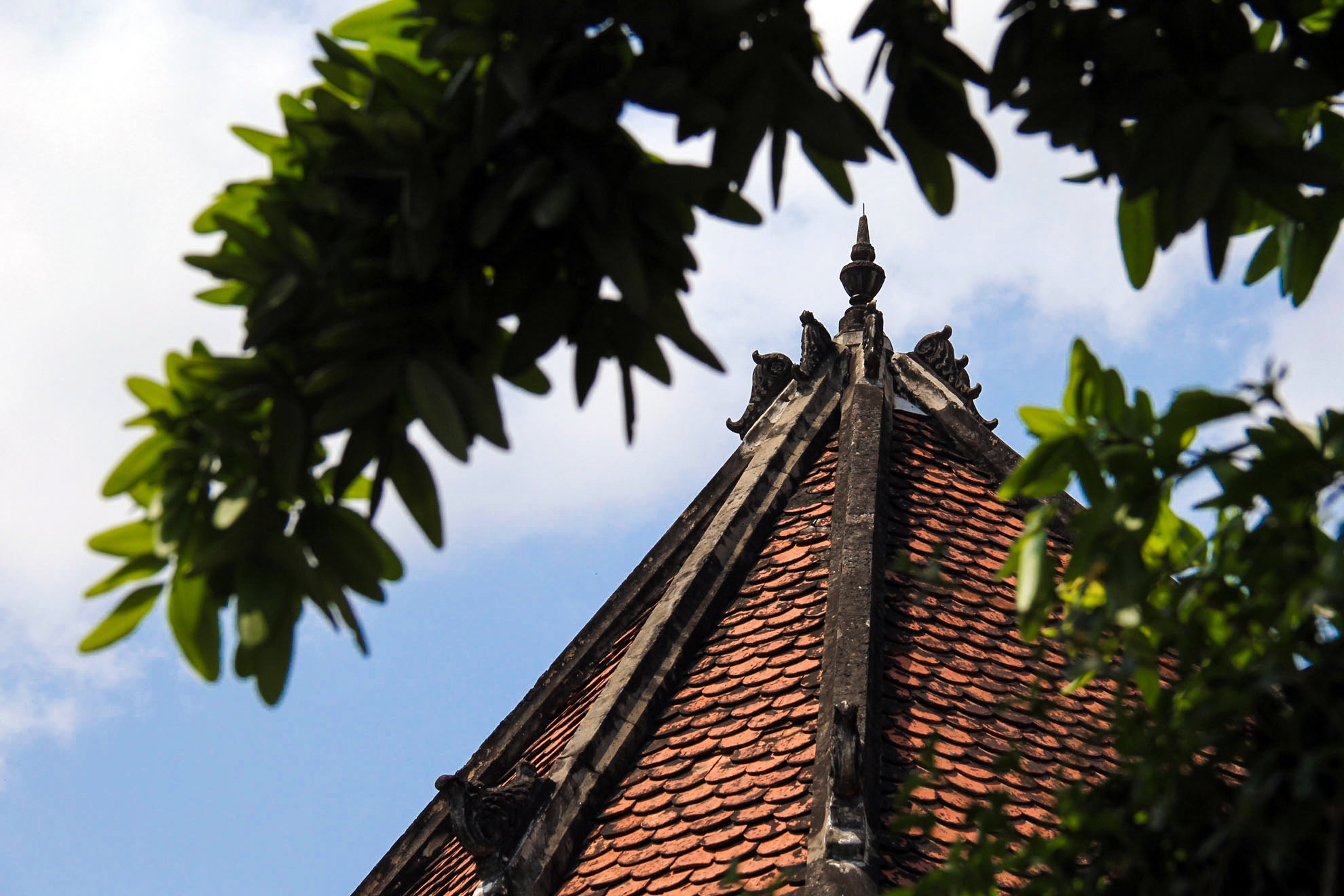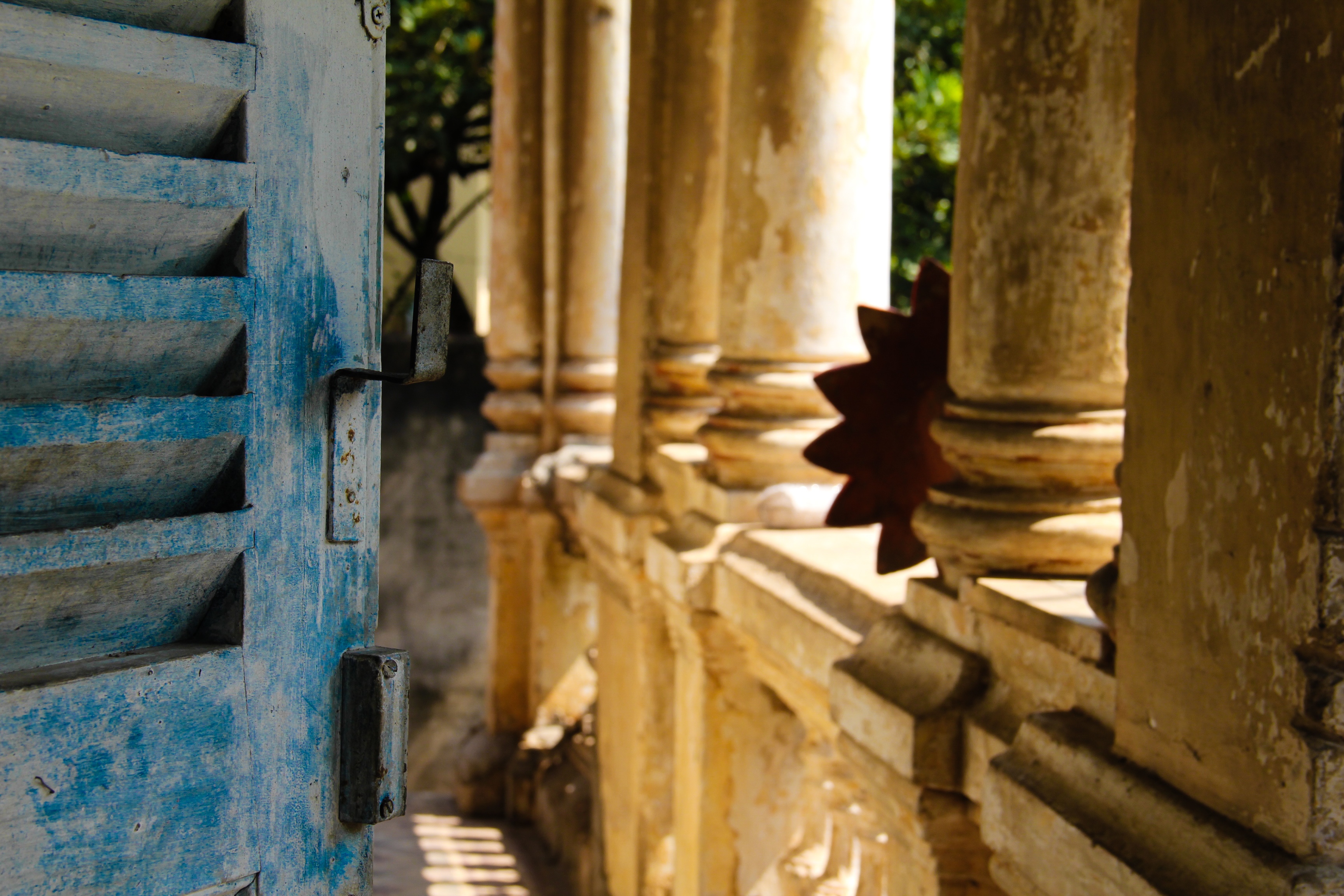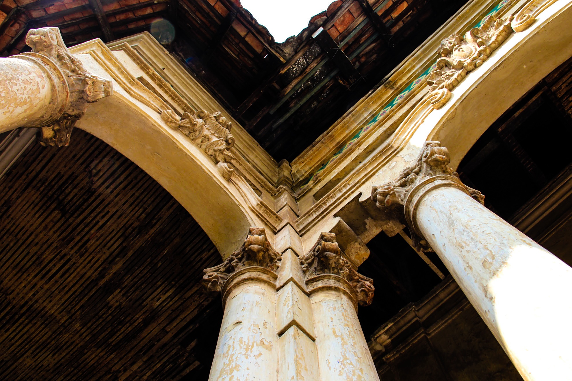 | Những nét hoa văn mang đậm nét kiến trúc Pháp thể hiện rõ trên cột. Trần nhà lợp bằng gỗ đã xuống cấp và mục nát dần. |