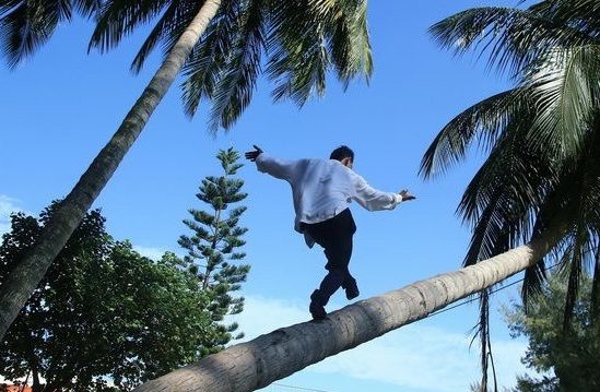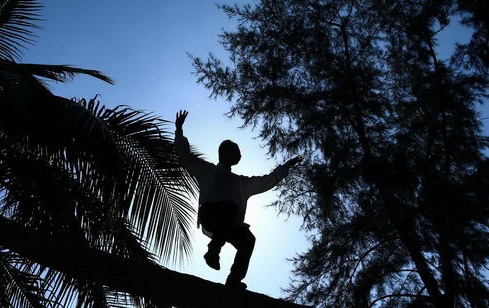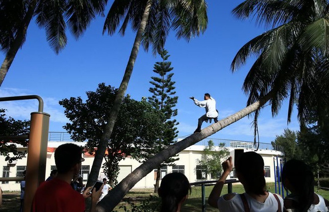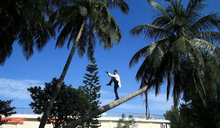 | Vị võ sư thực hiện màn trình diễn độc đáo trên cây dừa vào ngày 30/10. Ảnh: hinews.cn. |