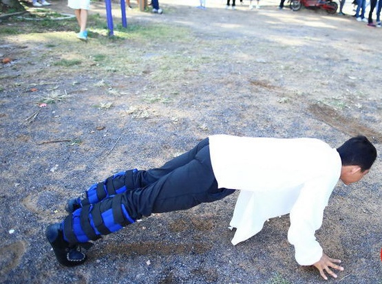 | Ông chống đẩy với vật nặng ở hai chân. Ảnh: hinews.cn. |