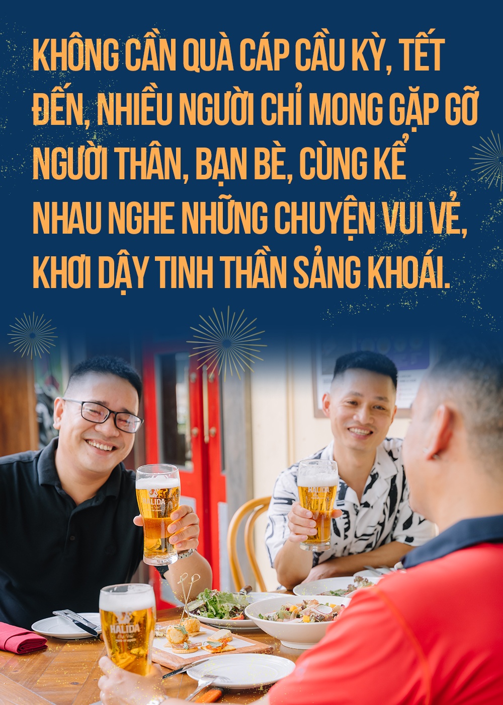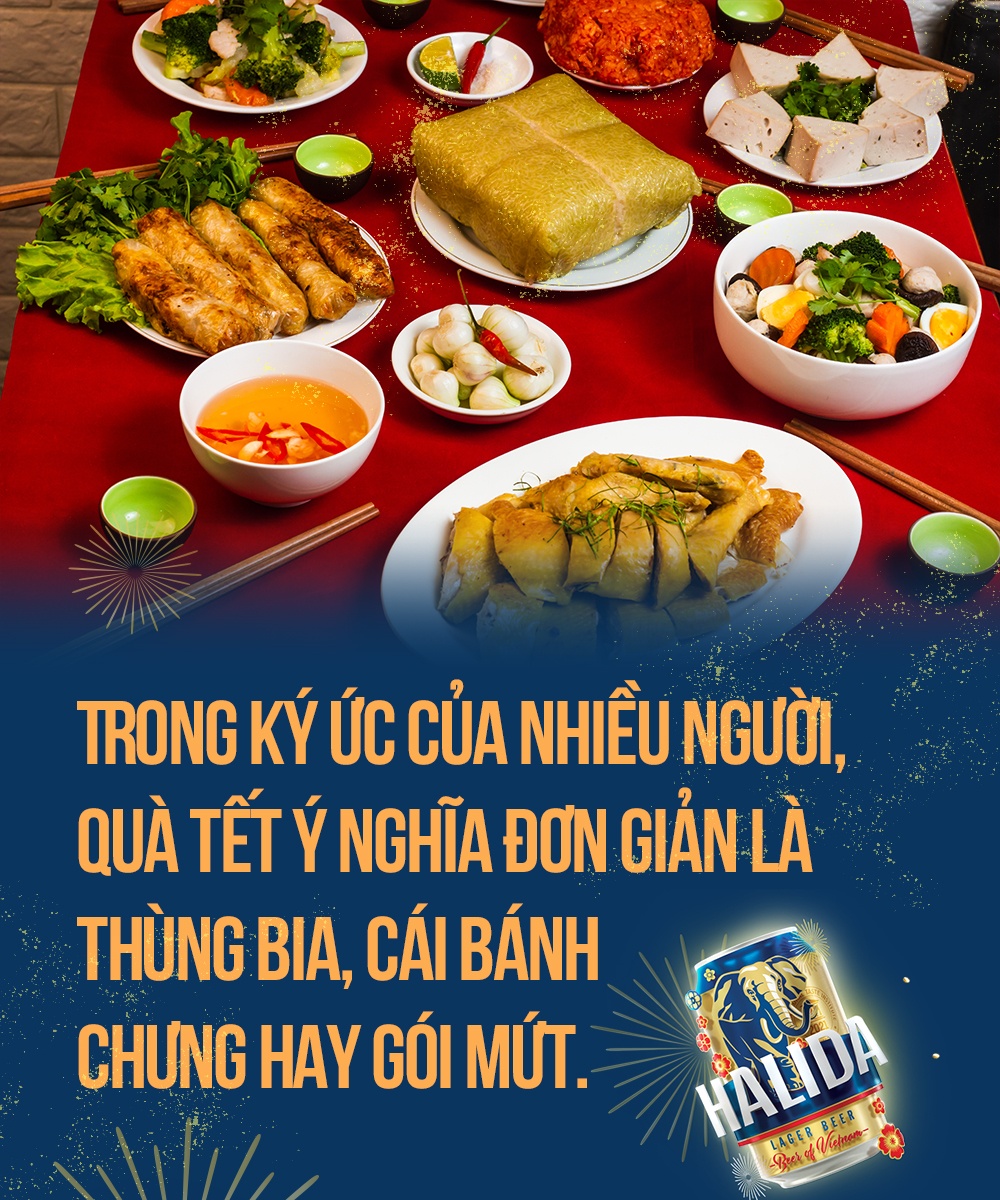 Thấy bạn mình tâm trạng tốt hơn, anh Ân tiếp lời: “Đùa chứ, Tết xưa nhà ông thích nhận quà gì, thì Tết nay mình tặng quà đó. Cứ bánh trái, gói mứt hay thùng bia con voi Halida là thấy Tết đủ đầy rồi. Mình tặng quà gợi lại ký ức xưa cũng hay và ý nghĩa ông ạ. Tôi nghĩ người thân của mình ai cũng mong mình năm mới vui vẻ thôi".