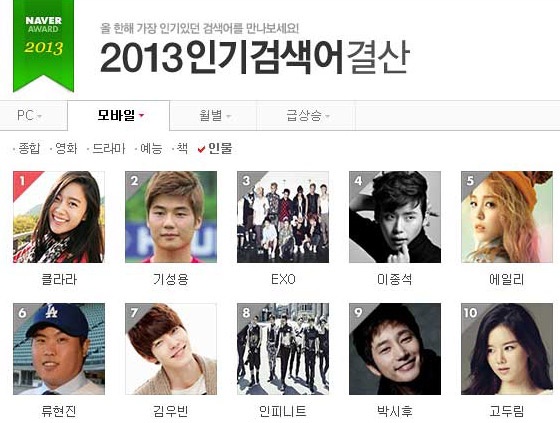 Trong khi đó, những cái tên sau Clara trên bảng xếp hạng ở các thiết bị di động là Ki Sung Yong, EXO, Lee Jong Suk, Ailee, Ryu Hyun Jin, Kim Woo Bin, Infinite, Park Si Hoo và Go Doo Rim.