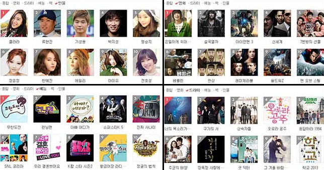 Trong khi đó, ở mảng show thực tế, Infinity Challenge thống trị trên cả PC lẫn mobile. Ngoài ra, những chương trình hấp dẫn khán giả khác có Running Man, Dad! Where Are We Going? Real Man, SNL Korea, We Got Married, Happy Together.