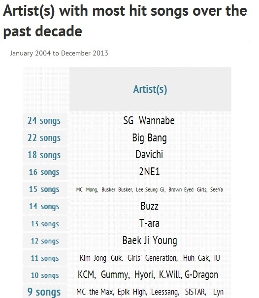 Vị trí đầu tiên thuộc về SG Wannabe (ra mắt năm 2004) với tổng cộng 24 hit, trong đó có 3 ca khúc nhóm bắt tay cùng Kim Jong Kook, Brown Eyed Girls và KCM. Vị trí thứ hai thuộc về Big Bang (ra mắt năm 2006) với 22 hit, tất cả đều là single riêng của nhóm, không kết hợp cùng nghệ sĩ khác. Hai hit High High và Oh Yeah của bộ đôi GD&TOP cũng nằm trong số này.