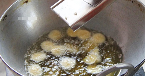 | Không chiên quá nhiều chuối cùng một lúc để tránh cho các miếng chuối bị dính vào nhau. Dùng muôi thủng đảo đều để chuối chín giòn các mặt. Đảo như vậy vài lần. |