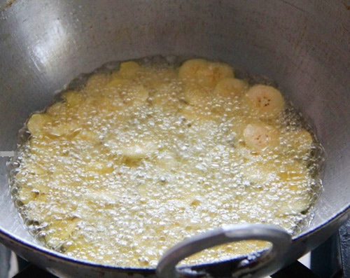 Chuối tiêu bóc vỏ rồi thái thành các lát tròn mỏng. Làm nóng dầu trong chảo sau đó thả các lát chuối vào chiên ngập.