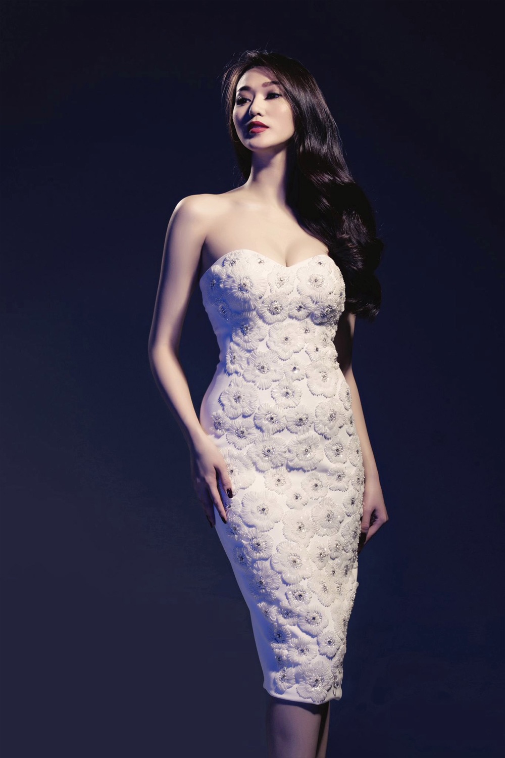 | Trong bộ ảnh mới, Khánh My diện hai chiếc váy bút chì đơn giản, khéo khoe phần eo thon và bờ vai trần gợi cảm. Cặp đôi diễn tả cảm xúc chìm đắm trong tình yêu. |