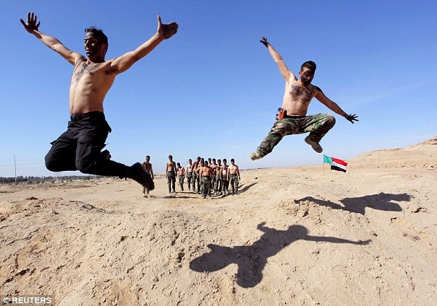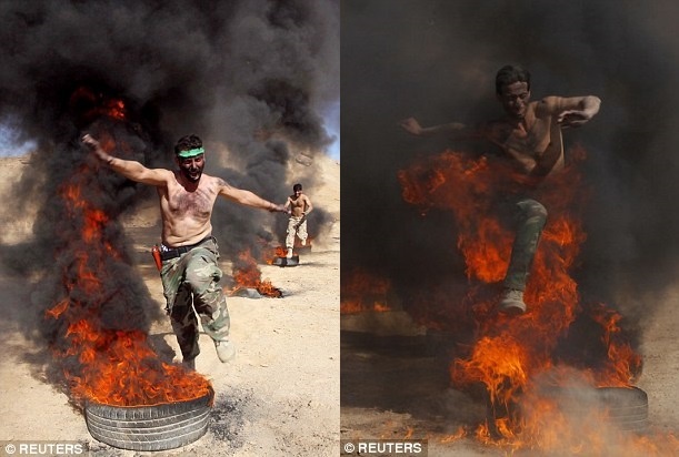 Dưới ánh nắng gay gắt của sa mạc, hàng chục người đàn ông mình trần trải qua các bài tập gian khổ để rèn luyện bản thân, chuẩn bị cho cuộc chiến chống IS.