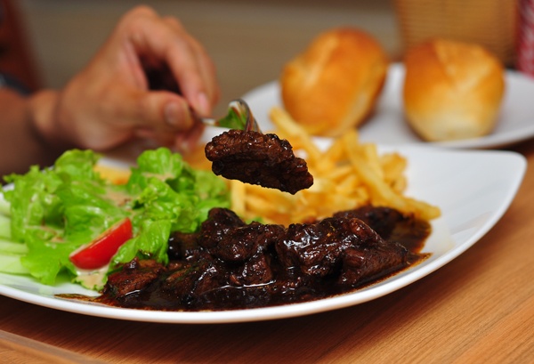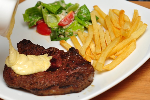 Bít tết ở đây được quảng cáo là sử dụng thăn vai bò Mỹ, miếng bít tết càng nhai càng ngọt. Nếu ăn "dỗ mồi", miếng bít tết như vậy chắc hẳn sẽ hết rất nhanh. Tuy nhiên, nhiều khách có cách thưởng thức thú vị - từ tốn bẻ đôi chiếc bánh mì, cắt thịt thành miếng nhỏ bỏ vào, cho thêm salad, quết nhanh ít pho mai, xong xuôi mới nhẩn nha thưởng thức. Hơi rườm rà song lại ngon miệng mà no lâu.