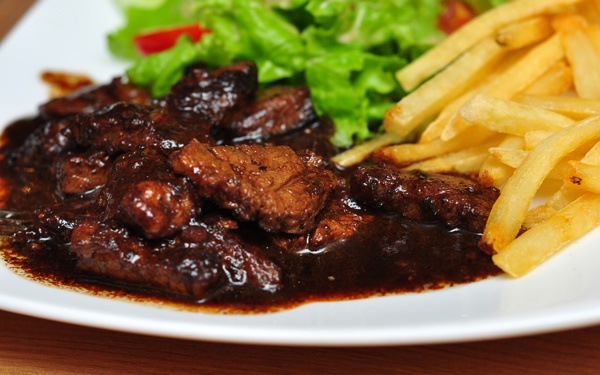 Ngoài ra, nếu ai sợ kiểu ăn nửa chín nửa sống, tiệm còn có món “bít tết lai” – bò tiêu đen kiểu Á, chắc chắn sẽ hợp khẩu vị nhiều người. Món này ngoài nguyên liệu thịt tươi ngon, có lẽ bí quyết nằm ở thứ nước sốt sanh sánh đậm đà, thơm mùi tiêu, chấm cùng bánh mì khiến khách thưởng thức hoài không chán.