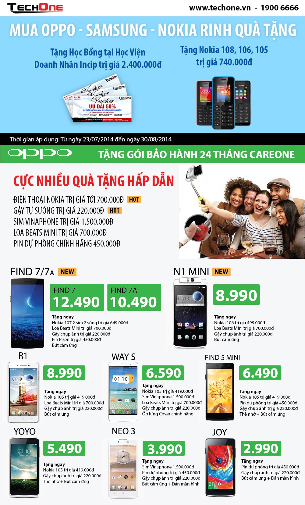 Nắm bắt xu hướng seflie của giới trẻ, mua điện thoại OPPO tại hệ thống của TechOne, khách hàng sẽ được nhận ngay gậy chụp ảnh tự sướng MonoPod trị giá 220.000 triệu đồng. Ngoài ra có nhiều quà tặng hấp dẫn khác: điện thoại Nokia, loa Bluethooth, sạc tích điện, thẻ nhớ và học bổng trị giá 2,4 triệu triệu đồng tại Học viện doanh nhân. Khách hàng còn được nhận ngay gói bảo hành Careone cho thời gian bảo hành lên tới 24 tháng.