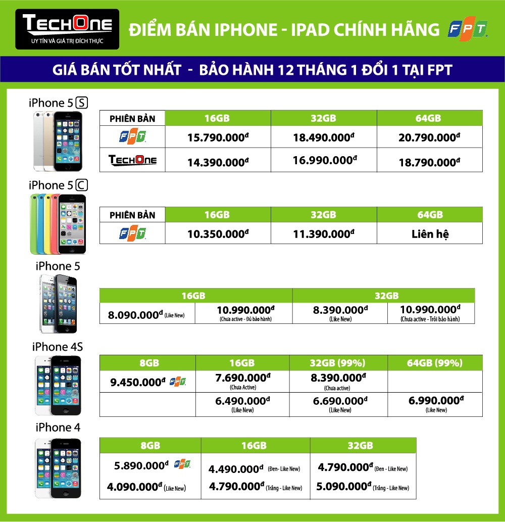 - iPhone 5S 16 GB (FPT): 15,79 triệu đồng (giá niêm yết: 18,79 triệu đồng), giảm 16%.