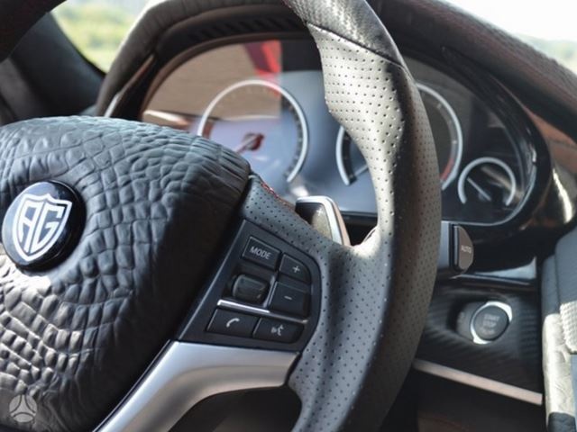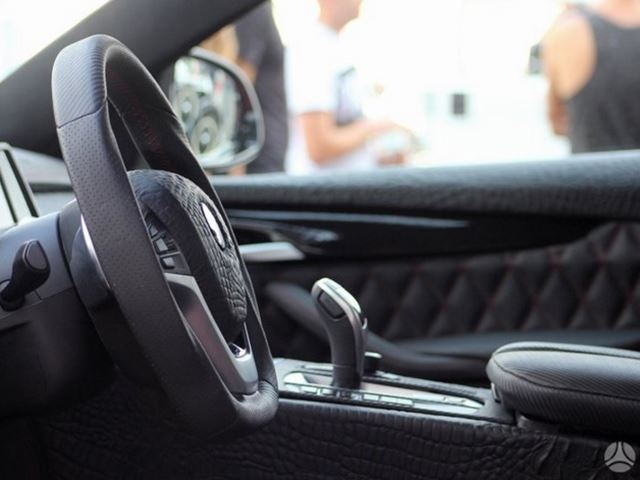 | Bên trong, ghế da được làm mới và được thêu thêm logo của hãng độ trên tựa đầu. Phần giả da cá sấu được đánh giá là làm mất vẻ sang trọng vốn có của BMW X6. |