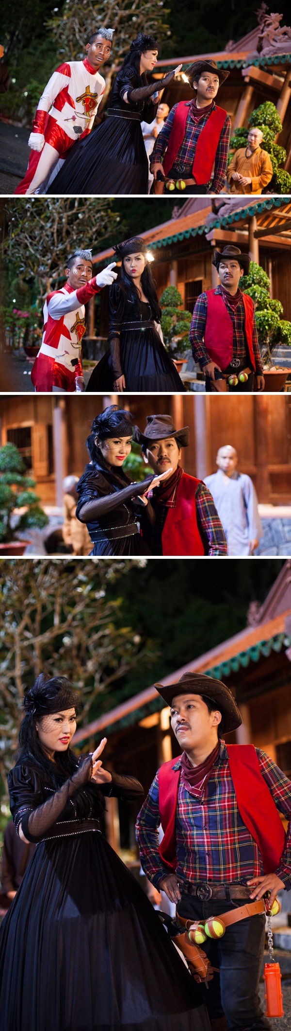 Bên cạnh dàn diễn viên chính như NSƯT Việt Anh, Hoàng Sơn, Cát Phượng, Nhật Cường, Lý Hải, Nhật Kim Anh… phim xuất hiện 3 tên trộm lẻn vào chùa đánh cắp báu vật do Phi Thanh Vân, Trường Giang và Nhật Trung đảm nhận. Mặc dù không nhiều đất diễn nhưng 3 tên đạo chính này được "o bế" hình ảnh một cách tỉ mỉ nên vừa diêm dúa vừa kỳ quặc. Nếu như Phi Thanh Vân ăn mặc kiểu nữ hiệp áo đen trong phim võ hiệp, sử dụng lá bài như những lưỡi dao sát thủ thì Trường Giang mang hình ảnh anh chàng cao bồi miền viễn Tây có tuyệt chiêu súng ngắn “bách phát bách trúng”, còn Nhật Trung bó người trong bộ trang phục siêu nhân, sở hữu ngón ném phi tiêu nhanh như chớp.