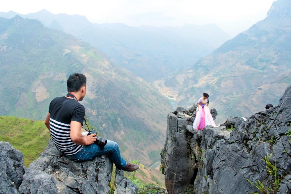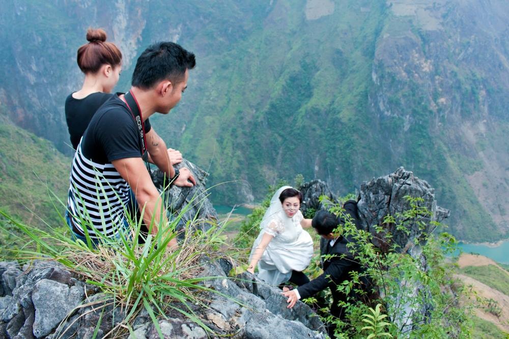 Theo nhiếp ảnh gia, để chụp được những bức hình độc đáo nhất, không chỉ phó nháy, các cặp đôi phải rất vất vả và không sợ nguy hiểm. Nhiều khi, cả ê-kíp chụp phải cheo leo trên vách đá, phía dưới là độ cao hàng trăm mét. Đôi lúc cô dâu chú rể phải dừng lại ở đoạn đường bé xíu và không có vách ngăn.