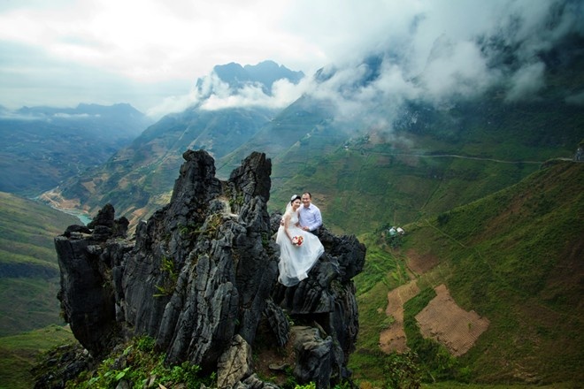 Mới đây, bộ ảnh cưới được thực hiện trên độ cao 1.200 m của chú rể Nguyễn Ngọc Hải (31 tuổi, quê Quảng Ninh) và cô dâu Nguyễn Thị Thu (24 tuổi, quê Hà Giang) nhận được sự quan tâm của độc giả Zing.vn.