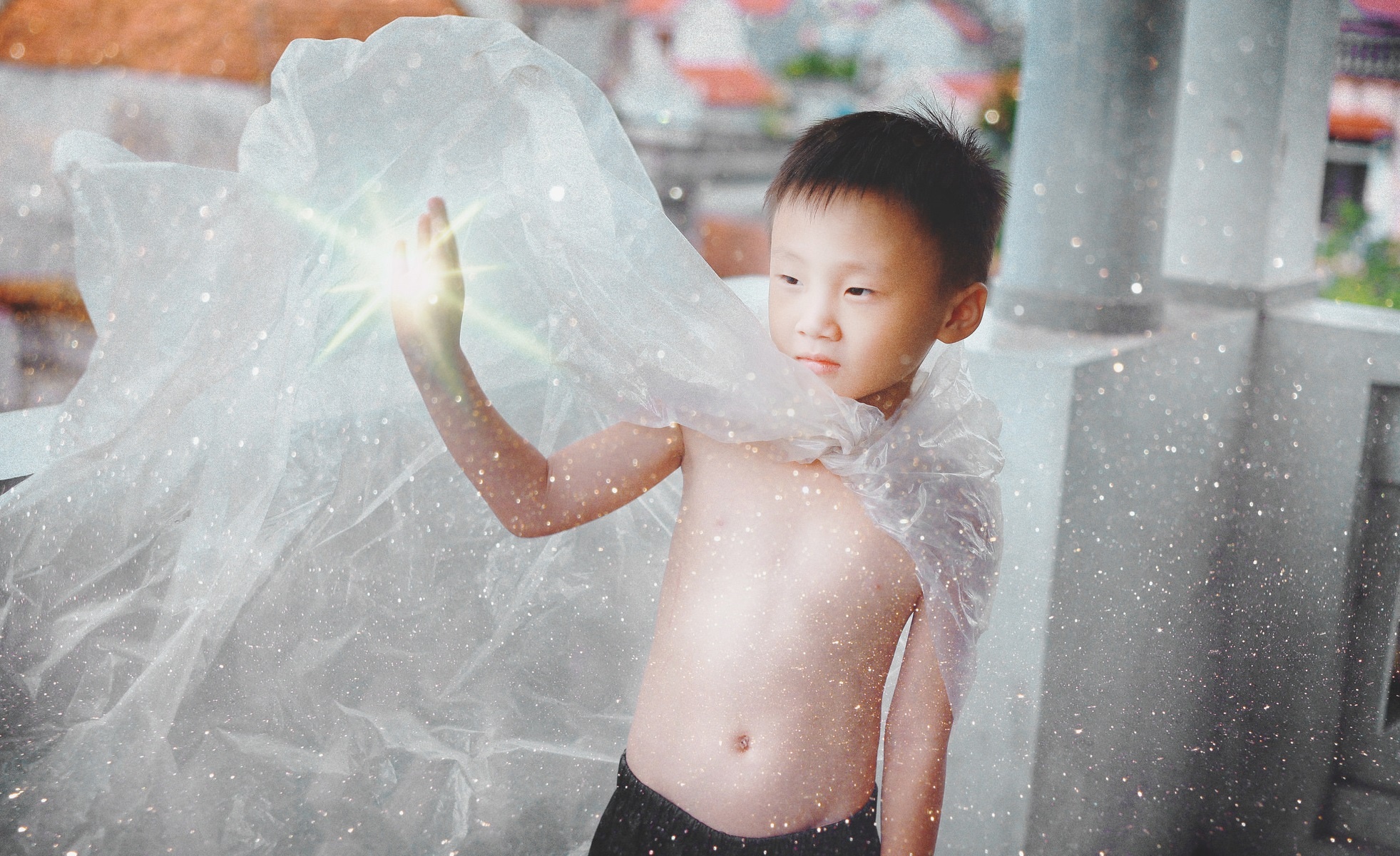| Đứa trẻ tưởng tượng mình có phép thuật, đứng trong hào quang. |