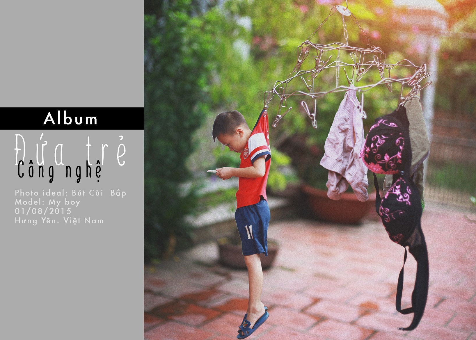 | Mới đây, trên các diễn đàn dành cho giới trẻ lan truyền bộ ảnh có tên Đứa trẻ công nghệ. Tác giả của các bức hình này Đỗ Xuấn Bút, sinh năm 1992, tốt nghiệp Đại học Sư phạm kỹ Thuật Hưng Yên. Tác phẩm đề cập đến hiện trạng - nhiều ông bố bà mẹ chọn cách đưa cho con đồ chơi công nghệ để chúng ngoan ngoãn, không quấy khóc. Vì vậy, việc trông trẻ như phơi quần áo - phơi ra lúc sáng, tối về mang chúng vào. |
