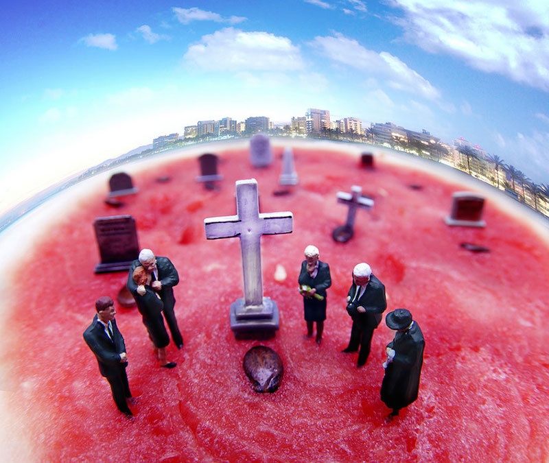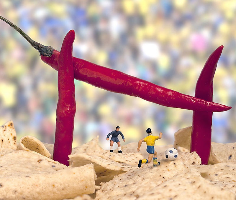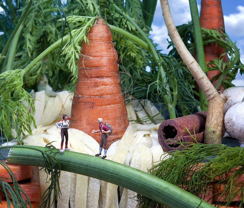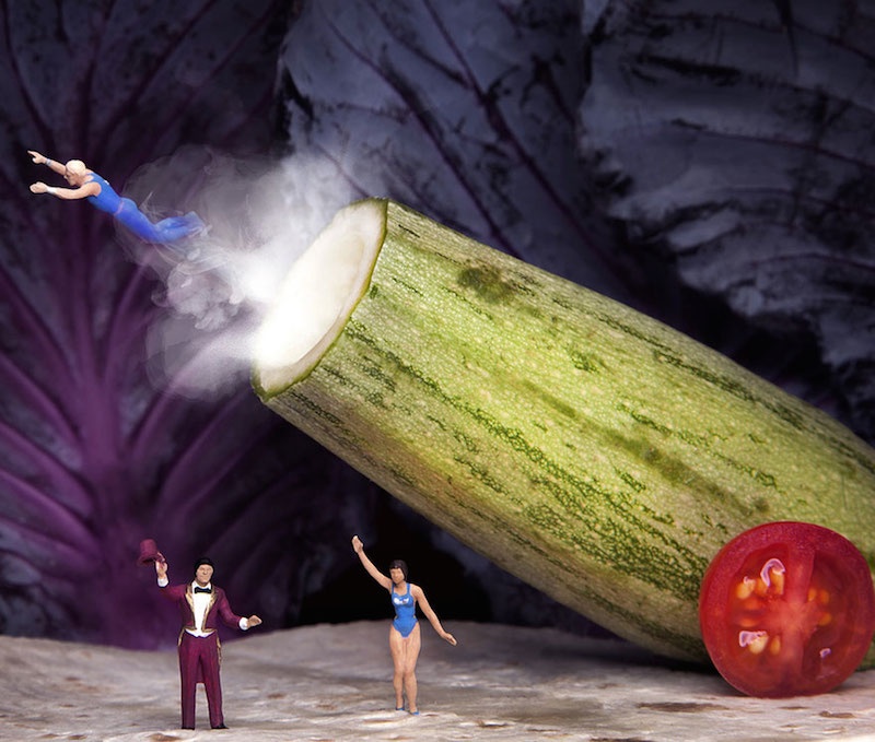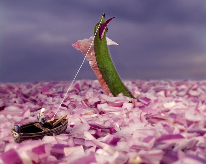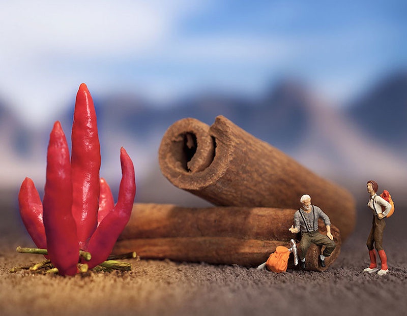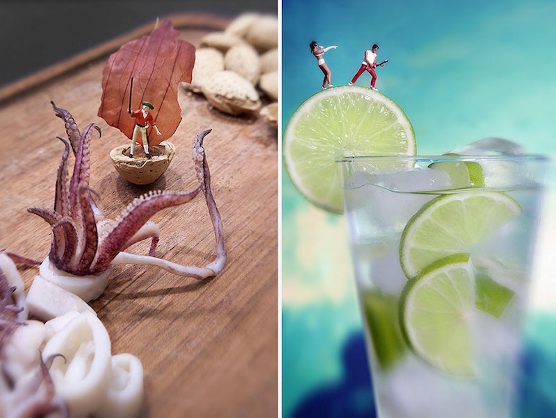 | Trong các sáng tạo của anh, bộ ảnh về thế giới người tí hon trong khung cảnh các đồ ăn, vật dụng quen thuộc là nổi bật nhất. |