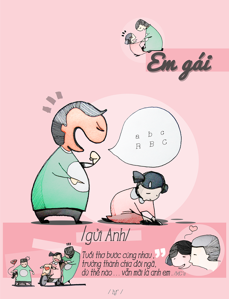 | Bức ảnh em gái gửi anh trai là cảnh người anh chăm sóc, dạy dỗ, chiều chuộng em. Qua đó, cô gái muốn nhắn nhủ người anh rằng: "Tuổi thơ bước cùng nhau, trưởng thành chia đôi ngã, dù thế nào vẫn mãi là anh em". |