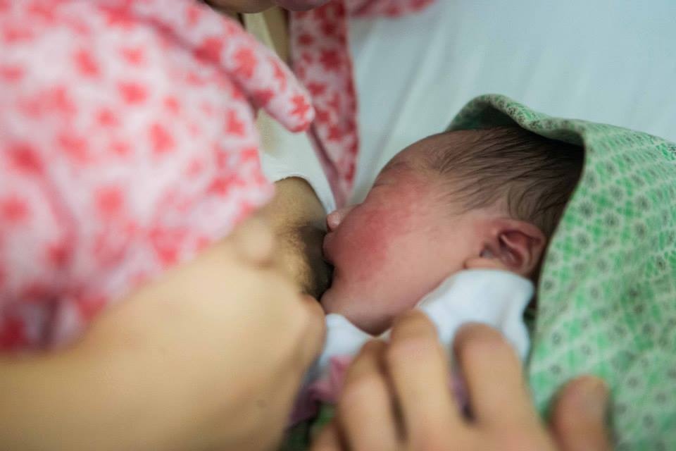 | Chị Trang cho con bú giọt sữa đầu tiên. |