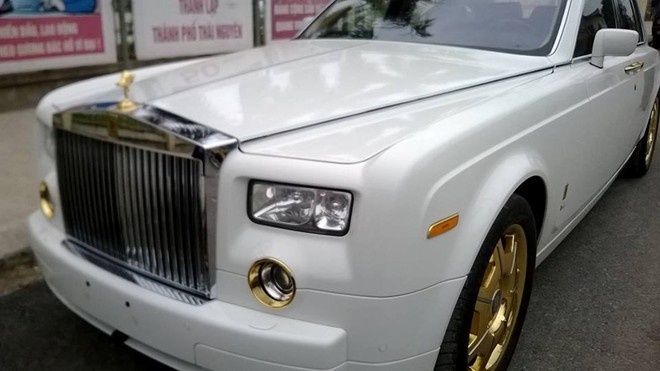 Trong dàn xe sang ở Thái Nguyên, chiếc Rolls-Royce Phantom trắng tinh khôi nổi bật với bộ la-zăng, logo, viền đèn, tay nắm cửa mạ vàng.