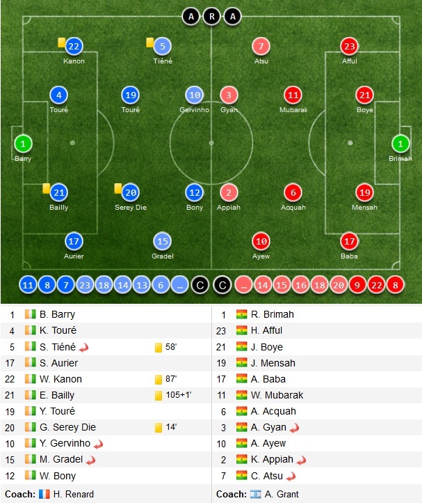 | Tuy nhiên, trong suốt 90 phút thi đấu chính thức và 30 phút của hai hiệp phụ, Gervinho và đồng đội không thể khoan thủng mành lưới của Ghana. |