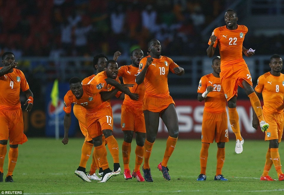 | Các cầu thủ Bờ Biển Ngà vỡ òa khi Barry dứt điểm thành công loạt sút quyết định. |