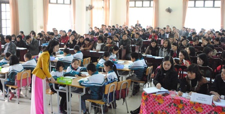 | Trước khi tập huấn Thông tư 30, các đại biểu tham gia tiết học mẫu theo mô hình "trường học mới' |