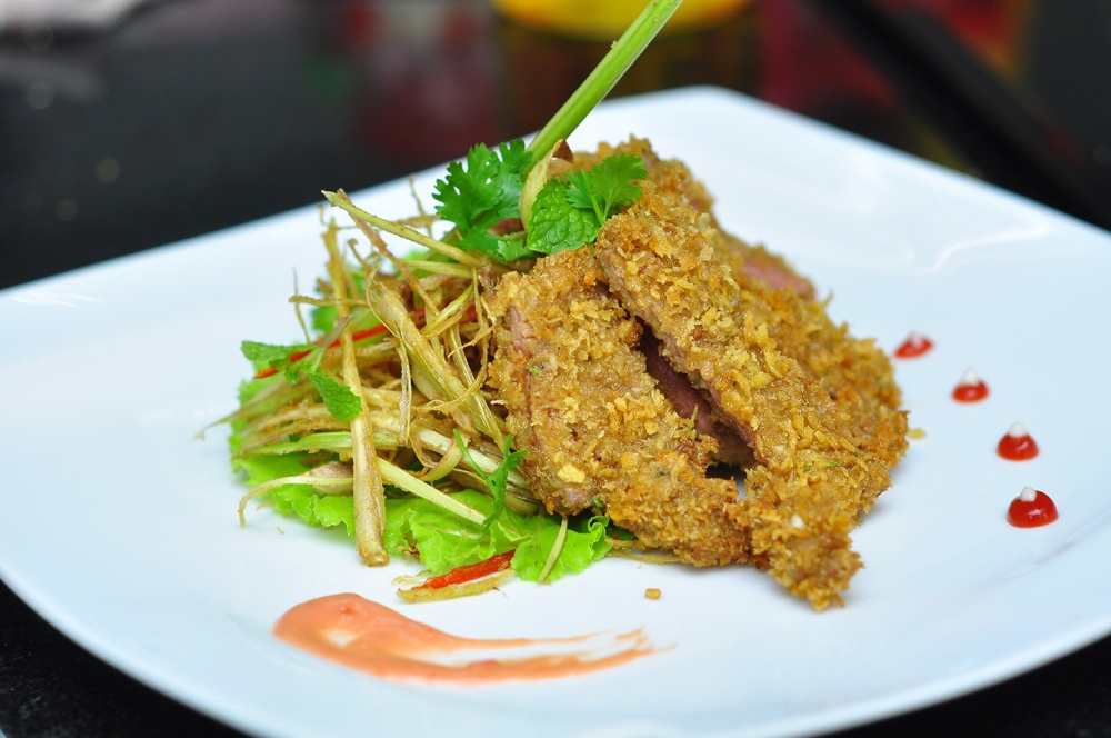 Cuối cùng, thái thành miếng nhỏ hơn, bày lên đĩa trang trí. Khi thái, thấy miếng thịt bò bên ngoài vàng rộm mà bên trong vẫn hơi hồng mới là đạt tiêu chuẩn.